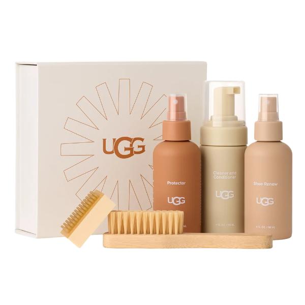 Our UGG® Care Kit NEW includes everything you need to clean and protect your UGG® sheepskin boots, shoes, and slippers. This cleaning set includes the Protector, Cleaner & Conditioner, Shoe Renew freshener, a bamboo handle brush, and a suede scuff eraser. UGG® Sheepskin Protector is a water-and-stain repellent spray that protects your shoes from the elements. For existing wear, our Cleaner & Conditioner rejuvenates sheepskin, while Shoe Renew freshening spray eliminates odor. Brushes and scuff erasers keep the finish fresh and clean.