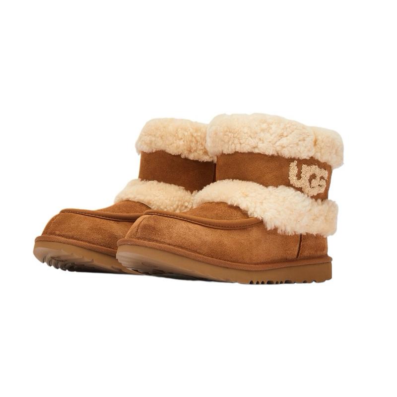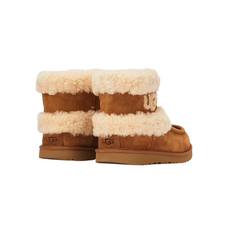 The UGG Ultra Mini Fluff Boot Kids “Chestnut” combines iconic UGG comfort with playful flair. Featuring plush sheepskin, a fluffy collar, and a low-cut silhouette, this cozy boot delivers warmth and style for little feet — perfect for everyday wear in cooler weather.
