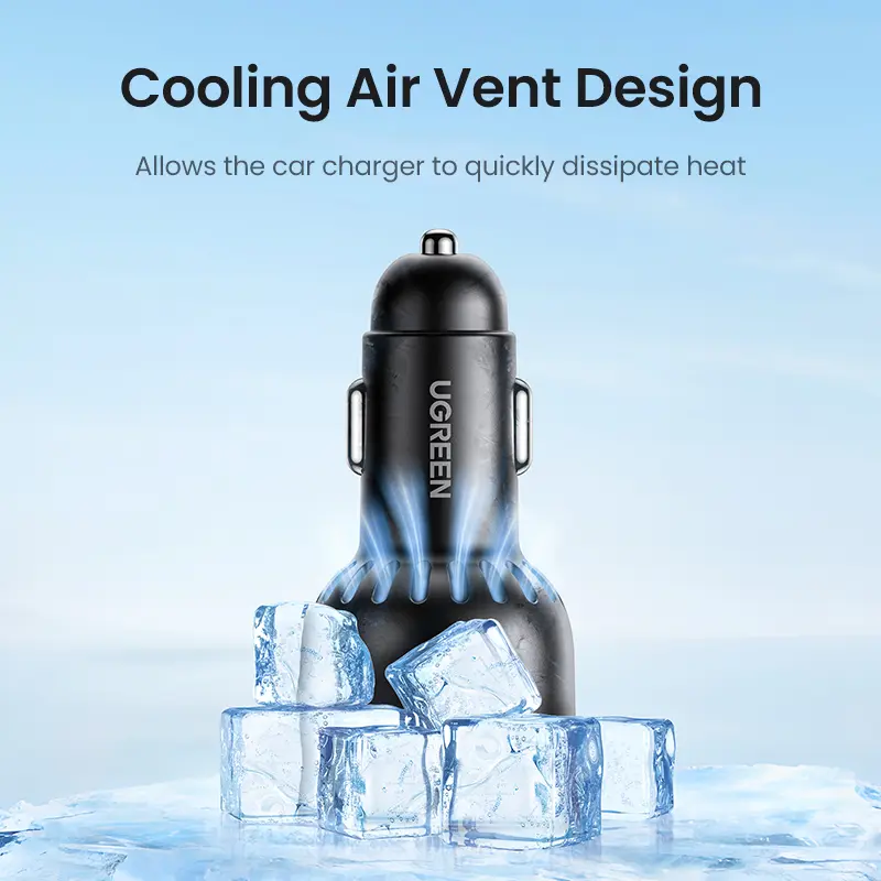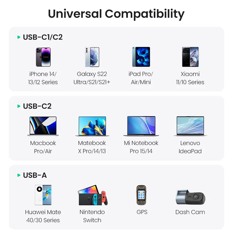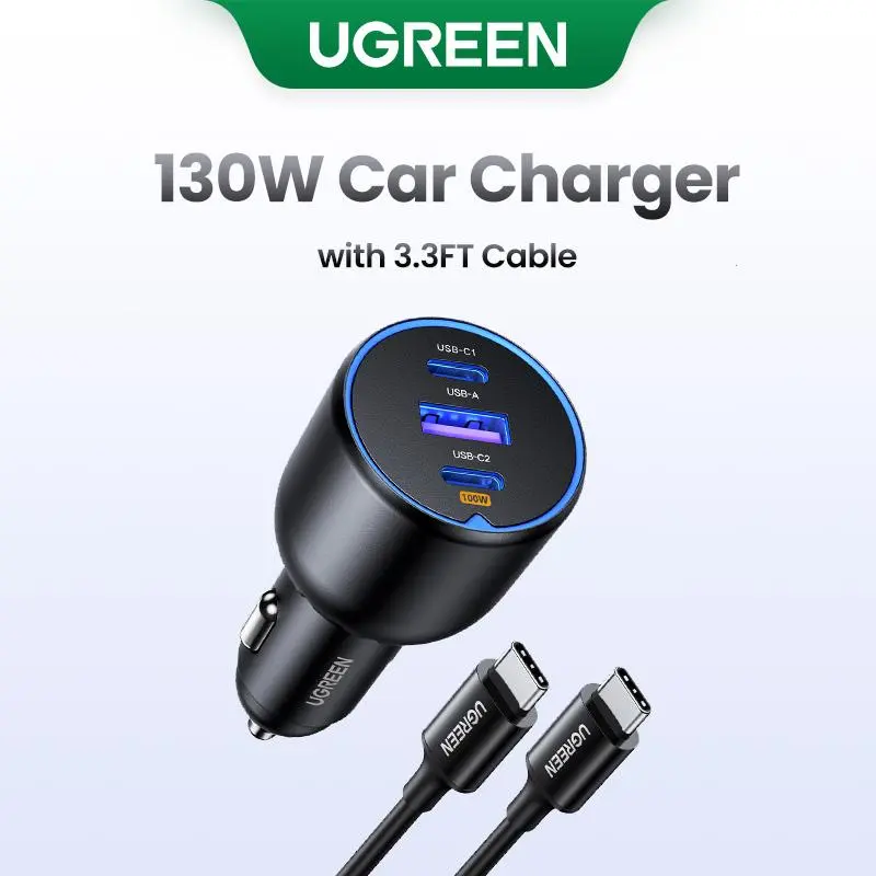 Equipped with one USB A port and two type-c ports, the UGREEN 130W USB C car charger charges 3 devices simultaneously. The dual PD Car Charger has 3 ports for high-speed charging your devices. The fast charge car adapter charges an iPhone 13 to 100% in about 1.5 hours, an iPad Pro/Air in around 2 hours, or a MacBook Pro in less than 2 Hours