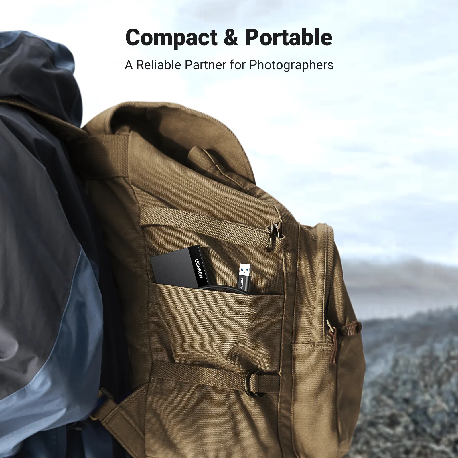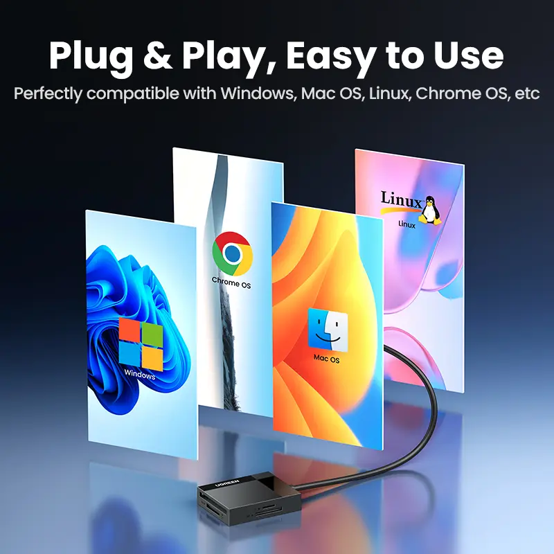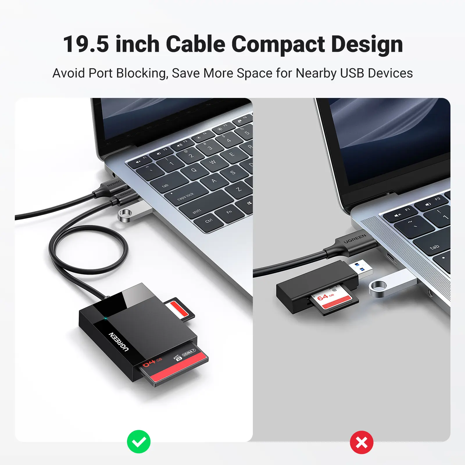2. 4 cards work simultaneously: The UGREEN USB memory card reader adopts 4 card slots of SD, TF, CF, and MS, which can read and write 4 different memory cards simultaneously. It will effectively save time for transferring and backing up photos or videos, avoiding repeated plugging and unplugging.