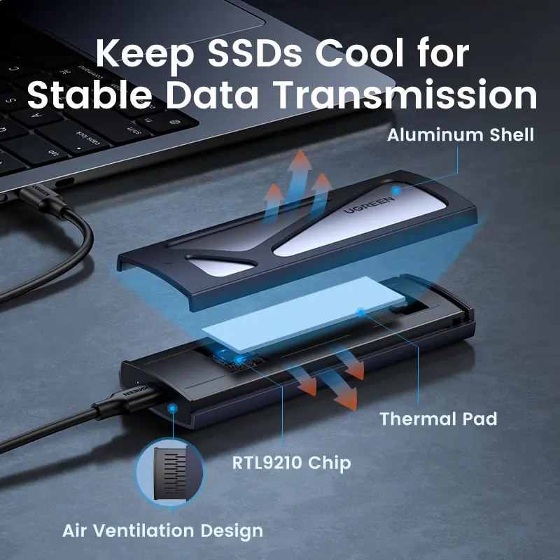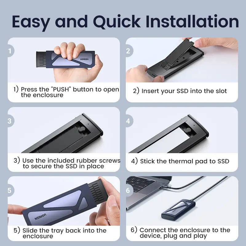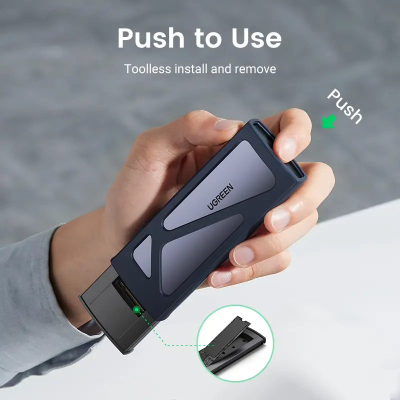 ·Tool-free SSD Enclosure: Tool-free NVMe SSD enclosure for quick and easy installation. Plug and play, no drivers required. The buckle design of the M.2 SSD enclosure can ensure stable and fast transfer