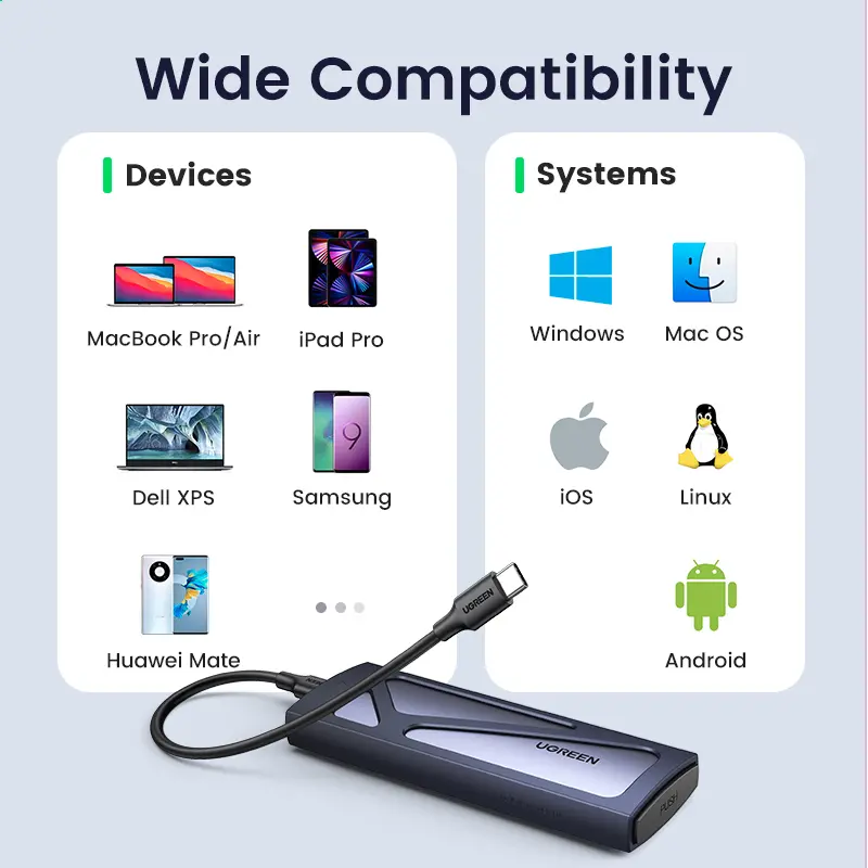 ·Broad Compatibility: The UGREEN M.2 NVMe SSD enclosure is specially designed to support NMVe protocol M/B&M keys and for 2230/ 2242/ 2260/2280 size SSDs up to 8TB. The M.2 NVMe enclosure is applicable for Windows, Mac OS, Linux, Android, IOS systems.(Does not support SATA NGFF SSD or mSATA SSD)
