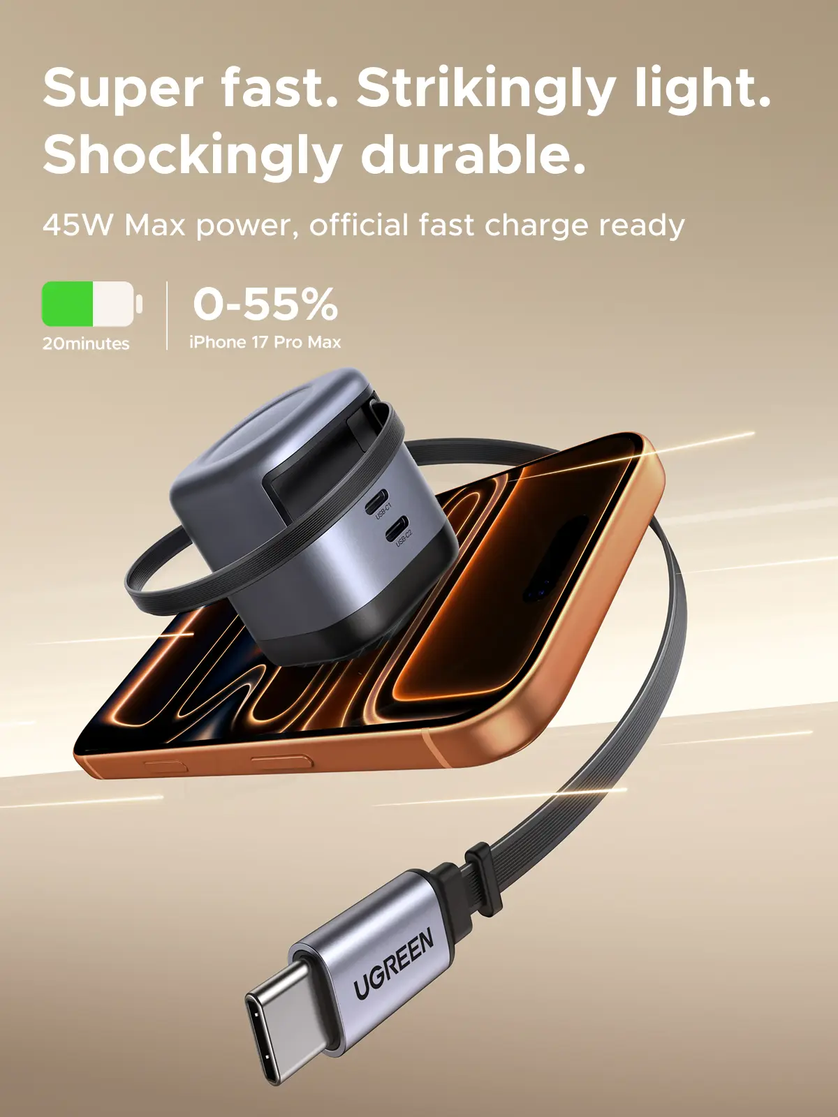 5. UGREEN Nexode Retractable 45W GaN Charger for iPhone 17, 3-Port USB C Fast Charger with 2.26ft Cable for iPhone 17/16/15/14/13 Series, Samsung Galaxy S25/24 Ultra, Pixel, iPad, Space Grey