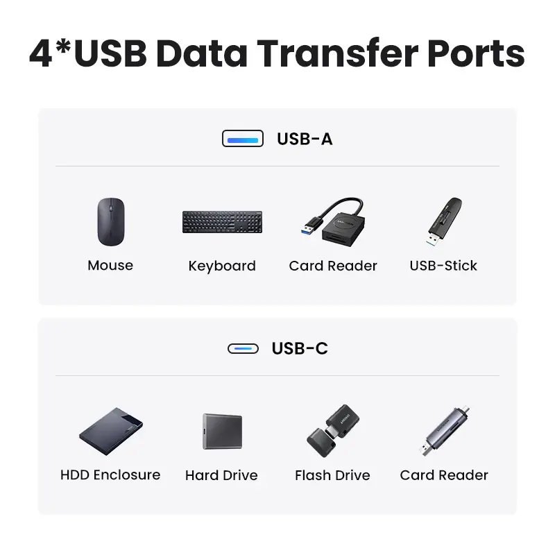 ·Start the USB 3.2 Era: Transfer files, movies, and photos at speeds up to 10 Gbps via the dual USB-C data port and dual USB-A ports.The C port marked with 10Gbps can only be used for data transmission, and does not support video output or charging.