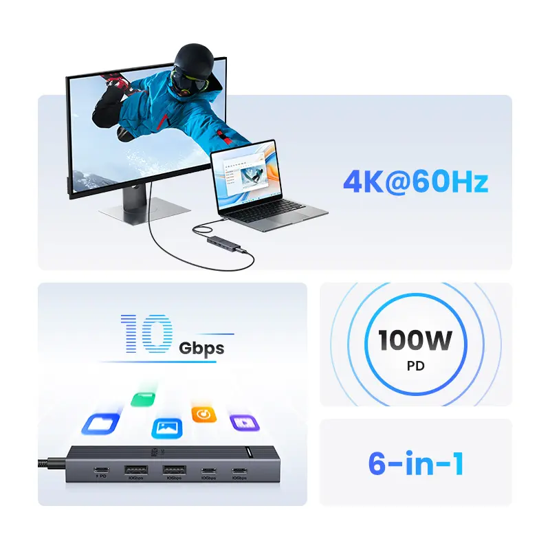·6-in-1 10Gbps USB C Hub: Inspire more potential of your laptop’s USB-C port with two 10 Gbps USB-C 3.2 Gen 2 port, two 10 Gbps USB-A 3.2 Gen 2 ports, 4K 60Hz HDMI and 100W Power Delivery.