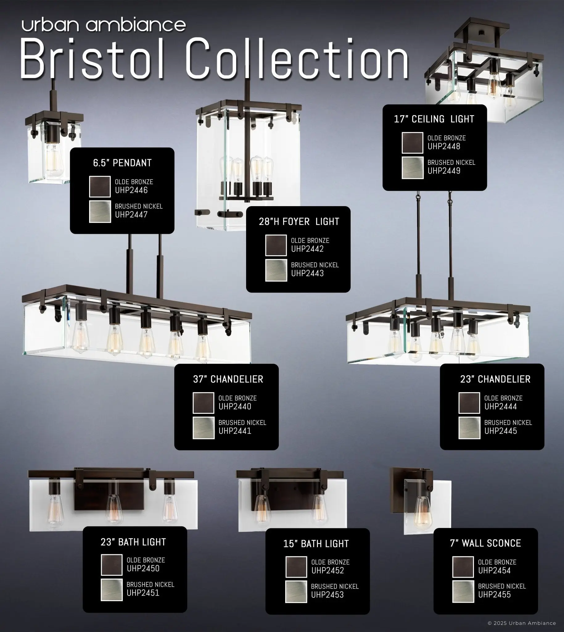The Bristol collection speaks a modern architectural language introducing a stunning focal point indoors. Albeit clothed in different configurations, the design cleanly displays a playful integration of clear beveled glass and sleek metalwork.In each configuration, the suspension detail makes a majestic entrance through charming mechanics seductive to the eye. The square arms singlehandedly uphold and secure clear beveled glass panes all around the shaded area without needing additional framing. The panes attach directly to metal slats reinforced toward the arched edges with bulky nuts. Minimal framing amplifies the illumination charm of beveled glass while enhancing the socket appeal.Available in Olde Bronze and Brushed Nickel as chandeliers, ceiling lights, pendants, and bath lights.