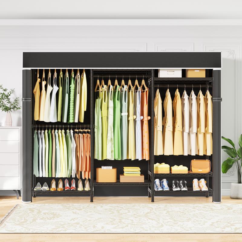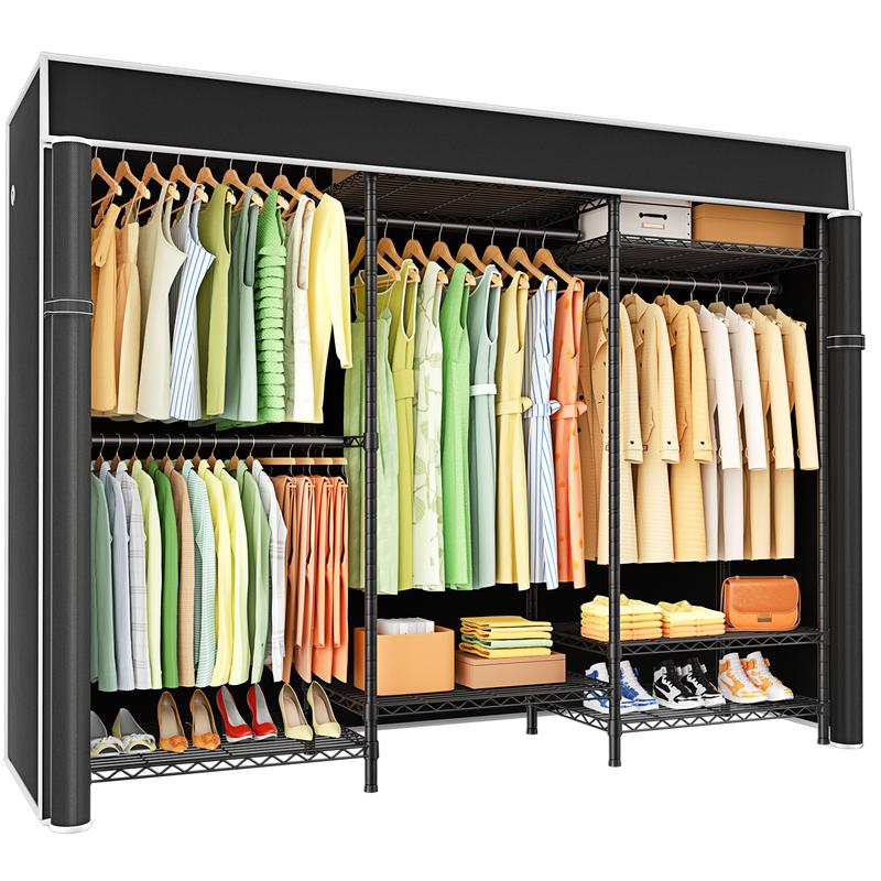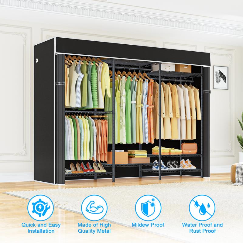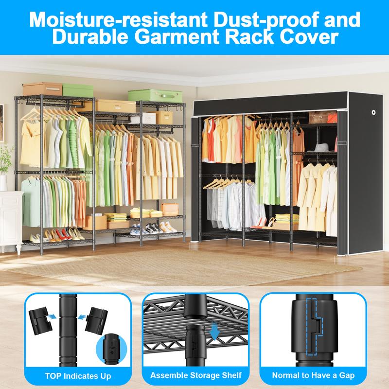·【STURDY & RELIABLE】Garment rack with cover made of high quality carbon steel,Makes it stable、sturdy and reliable,Not easy to tip over,Portable closets for hanging clothes adopt high quality black coating to protect it from water and rust,Weight Capacity:Total 960lbs ,The middle of two small shelf also enhances the stability of the closet organizer system when using,The two shelf can be disassembled,So that you get two independent clothes rack,Which can be used in different scenarios according to your needs and storage different items!