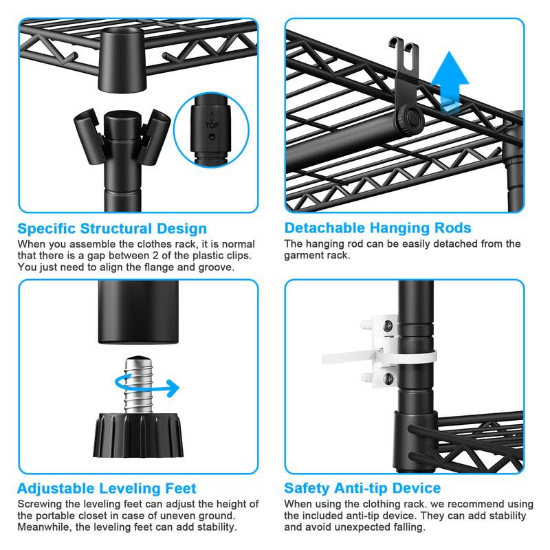 ·【PORTABLE & MULTI-SCENARIO】Our clothes racks for hanging clothes can be flexibly and freely assembled,You can take portable clothes rack anywhere you need it,Such as bedroom, laundry room, living room, cloakroom, hallway, etc,Coupled with the Anti-tip Device to enhance the stability of the heavy duty clothes rack,You will get a flexible closet organizer and storage system,Can be mobile or fixed!