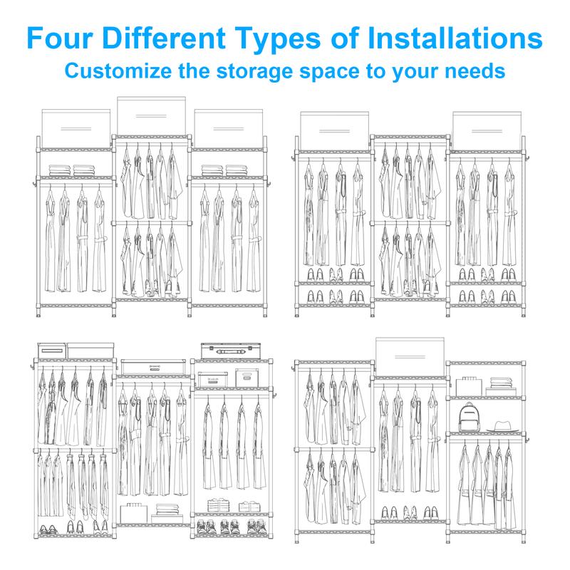 ·【ADJUSTABLE SHELVES】Clothing rack the 8 Tiers Shelfs,4 Hanger Rods and 8 S Hooks provide you with plenty of storage space,Can be assembled in a wide variety of forms,Each shelfs and hanger rods can be freely adjusted up and down according to your needs,Used to store different sizes of items,Such as long dresses, suits, coats, jackets, shirts, hats, shoes and boots or other heavy clothes,Easy to make storage space maximisation and flexibilisation,Making your life more convenient and easier!