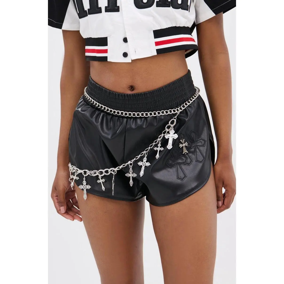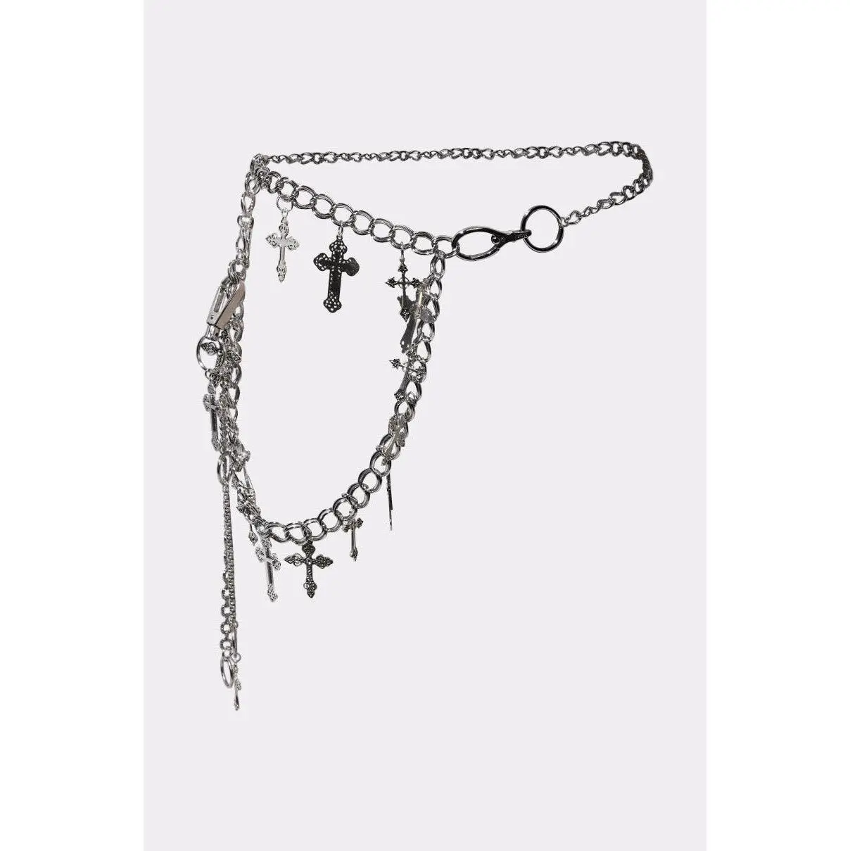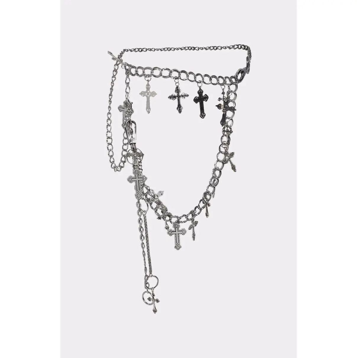 Blessed with bad intentions in The AKIRA Label Ultimate Cross Chain Belt. Crafted from a faux silver metallic base, this bold accessory features layered curb chains and oversized links adorned with an assortment of dangling cross charms and edgy hardware clips. It’s complete with an adjustable lobster clasp closure and an asymmetrical, draped silhouette. Whether styled over denim, dresses, or layered on outerwear, this festival-ready belt brings unapologetic attitude and divine detail to any outfit.- 100% Man-Made Materials- Imported(all measurements approximate from size O/S)- 43” Belt Length (circumference)Product ID: 1045116