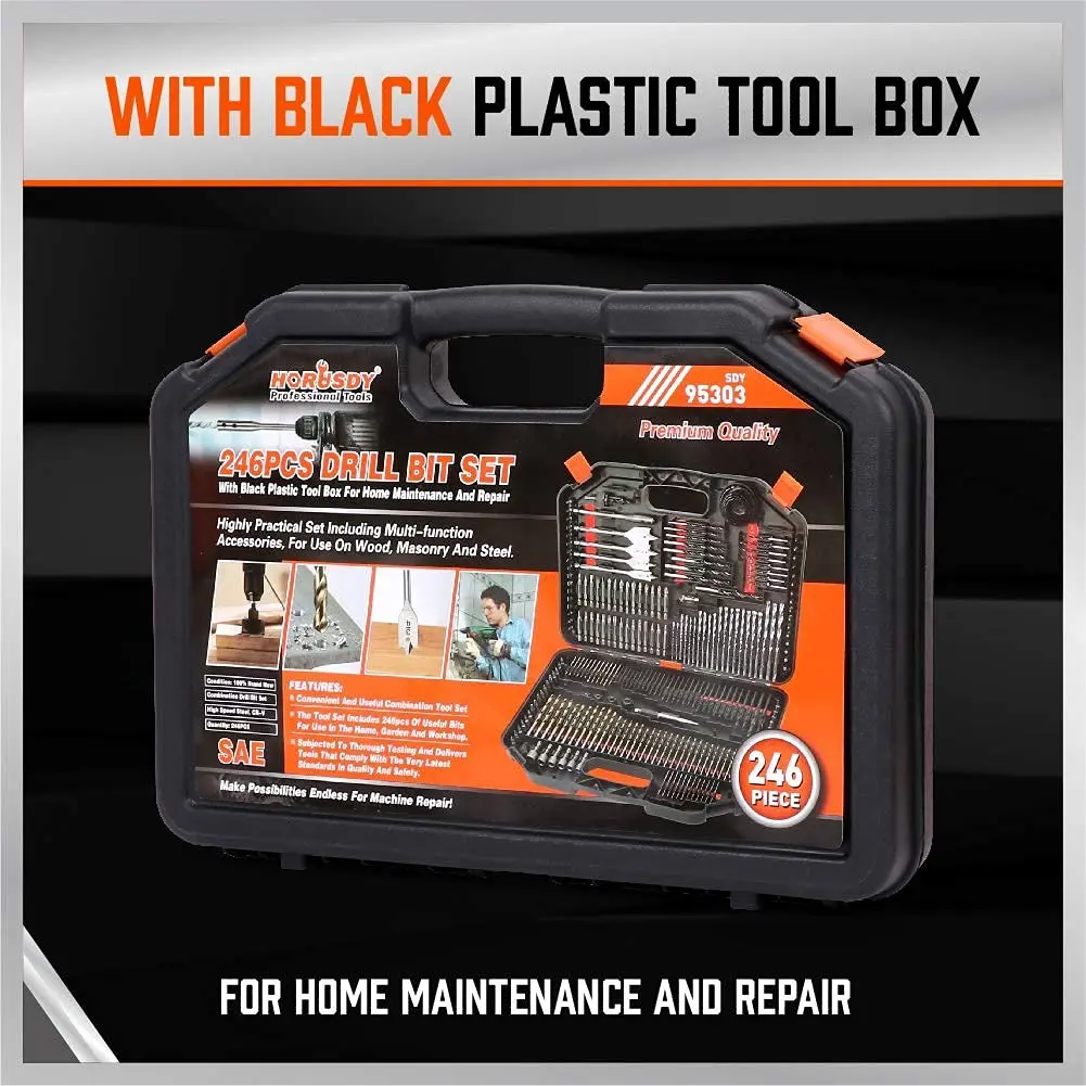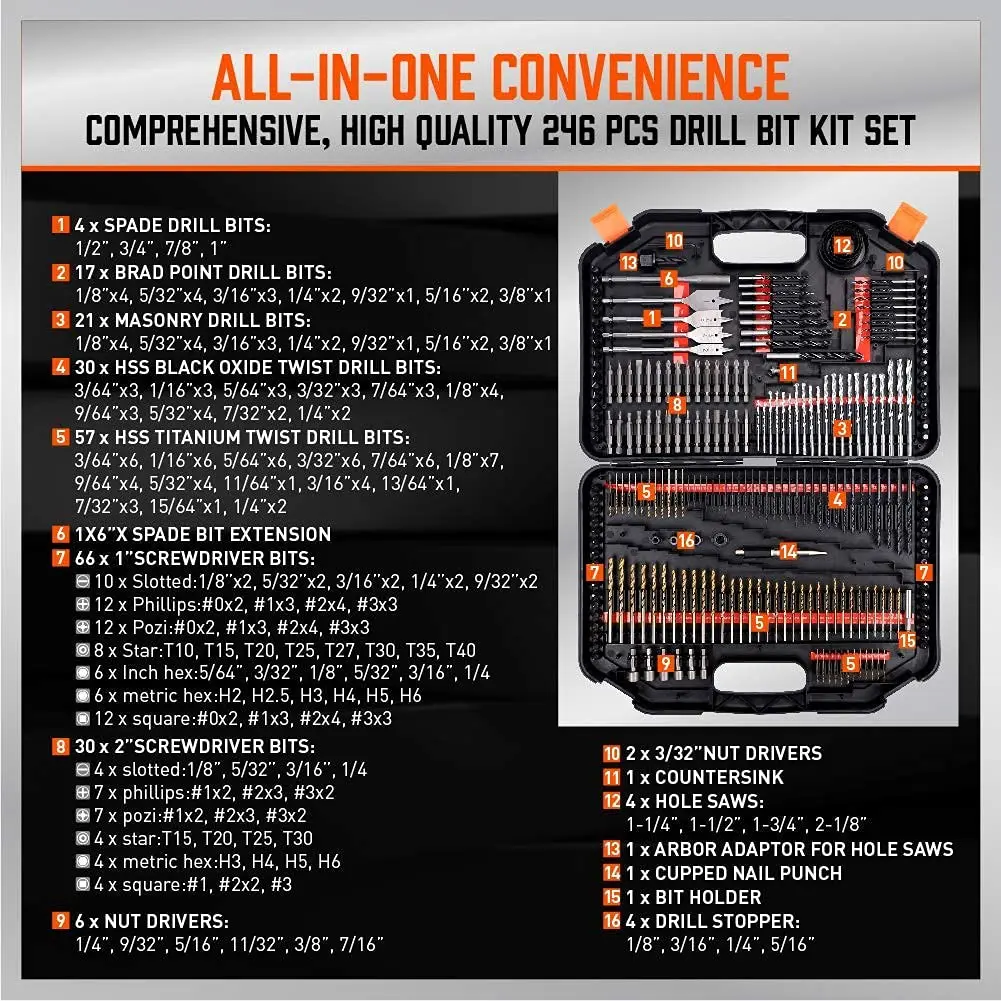 ·COMPREHENSIVE COLLECTION - Boasting 246 pieces, this drill bit set includes a variety of tools for drilling in wood, metal, and cement. The set is ideal for both professionals and DIY enthusiasts.