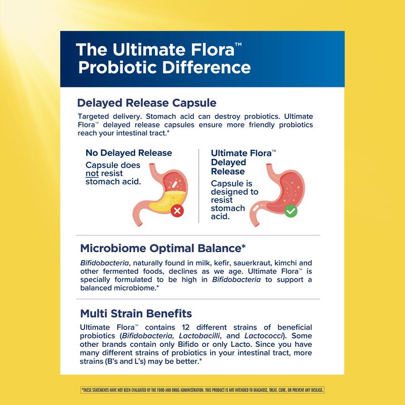 Feel your best every day—and help reduce occasional gas and constipation—with Ultimate Flora Extra Care 30 billion CFU probiotic. A single daily capsule provides 12 probiotic strains to promote digestive, respiratory and immune health.*