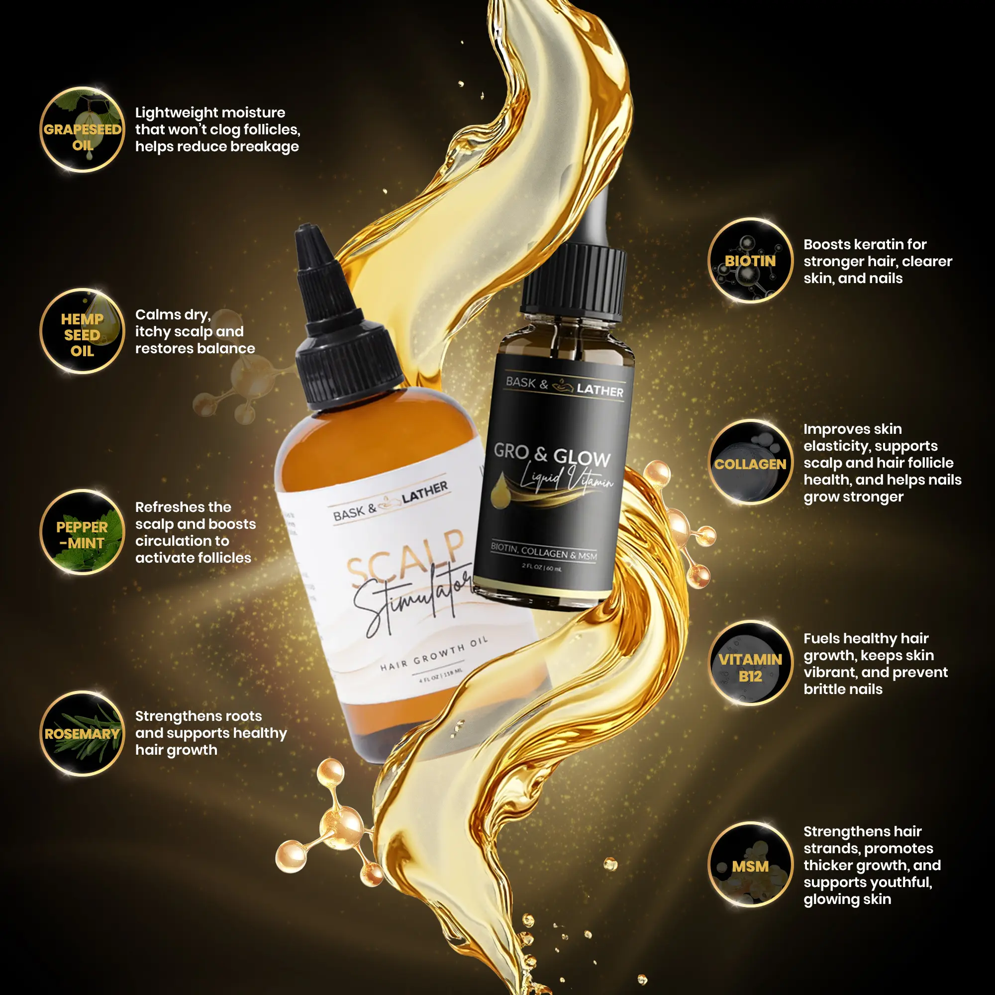 Start your growth journey right. This two-step system combines our best-selling Gro & Glow Liquid Vitamins with the Jumbo Scalp Stimulator. It energizes your scalp and strengthens your strands. Consistency meets results—because healthy hair starts with a healthy foundation.