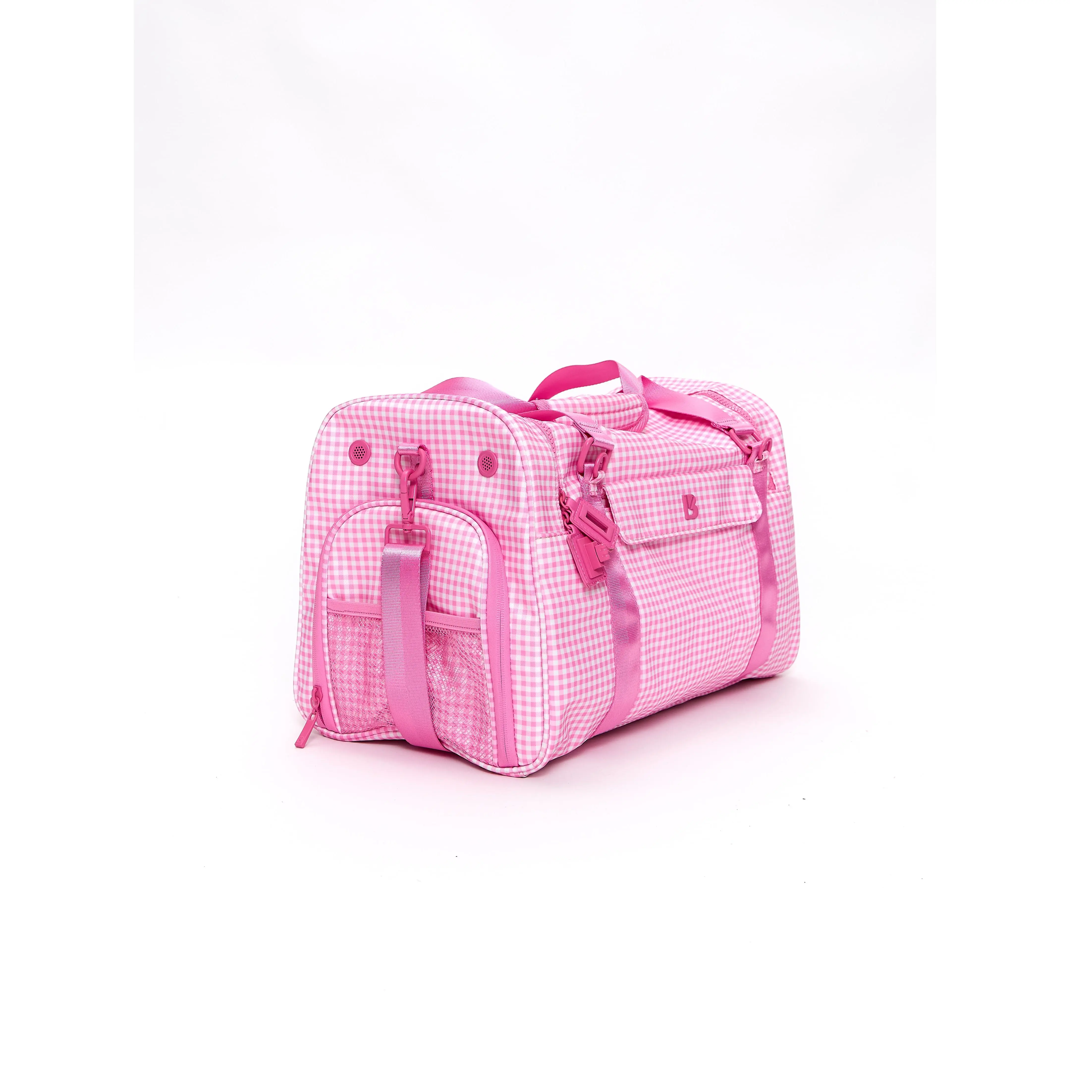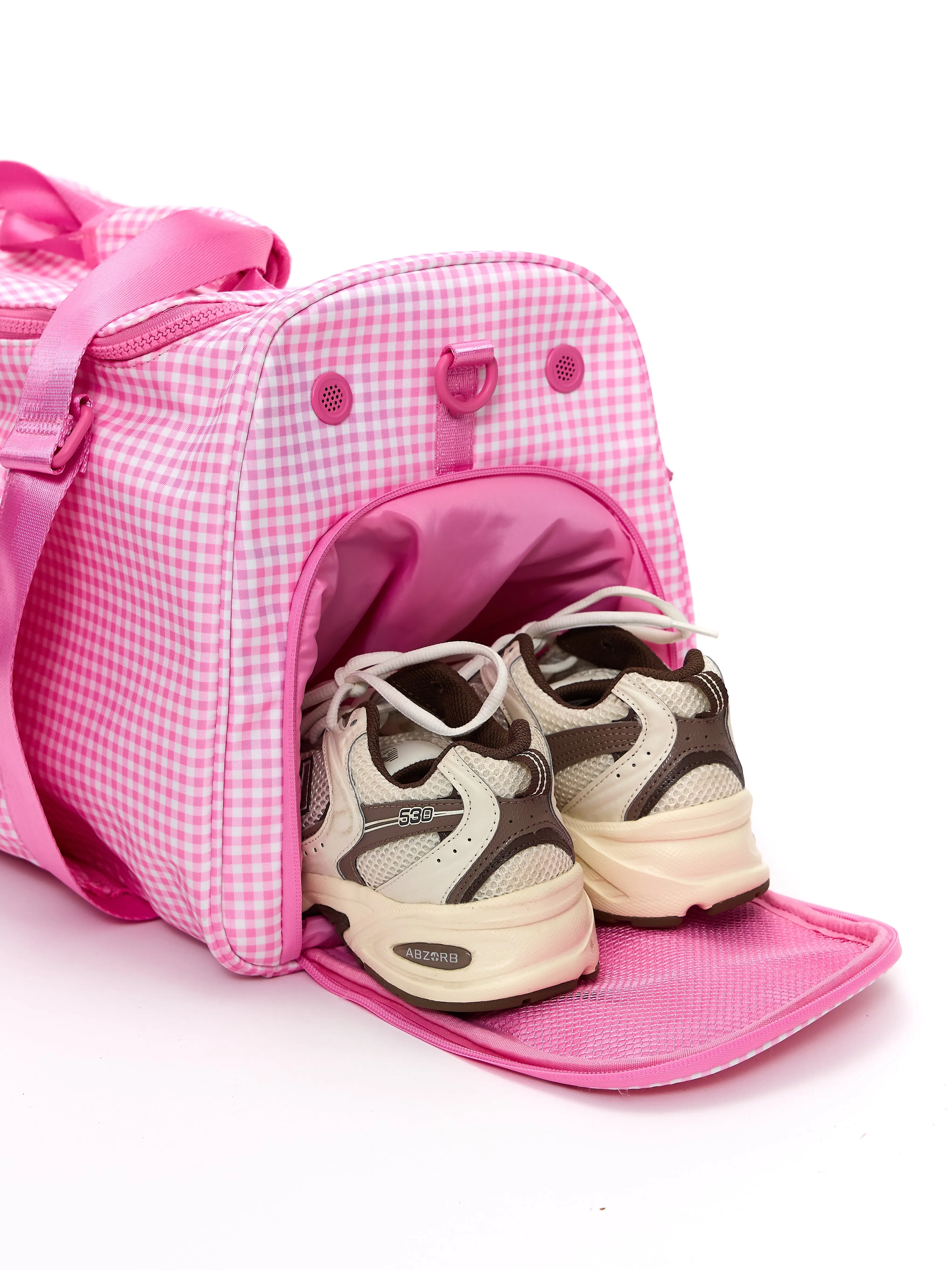 Love this bag! it was exactly what i was looking for with all the zipper compartments and organization. i would love for this to come in a slightly bigger size, like the game changer duffle. my only complaint is that some of the hardware came damaged and there are some loose threads. i also think buffbunny should come out with some cute bag charms! if you’re thinking about getting this bag i highly recommend it as it is perfect for anything, i will be using it as an overnight bag. also more colors please!! the pink gingham is too cute!
