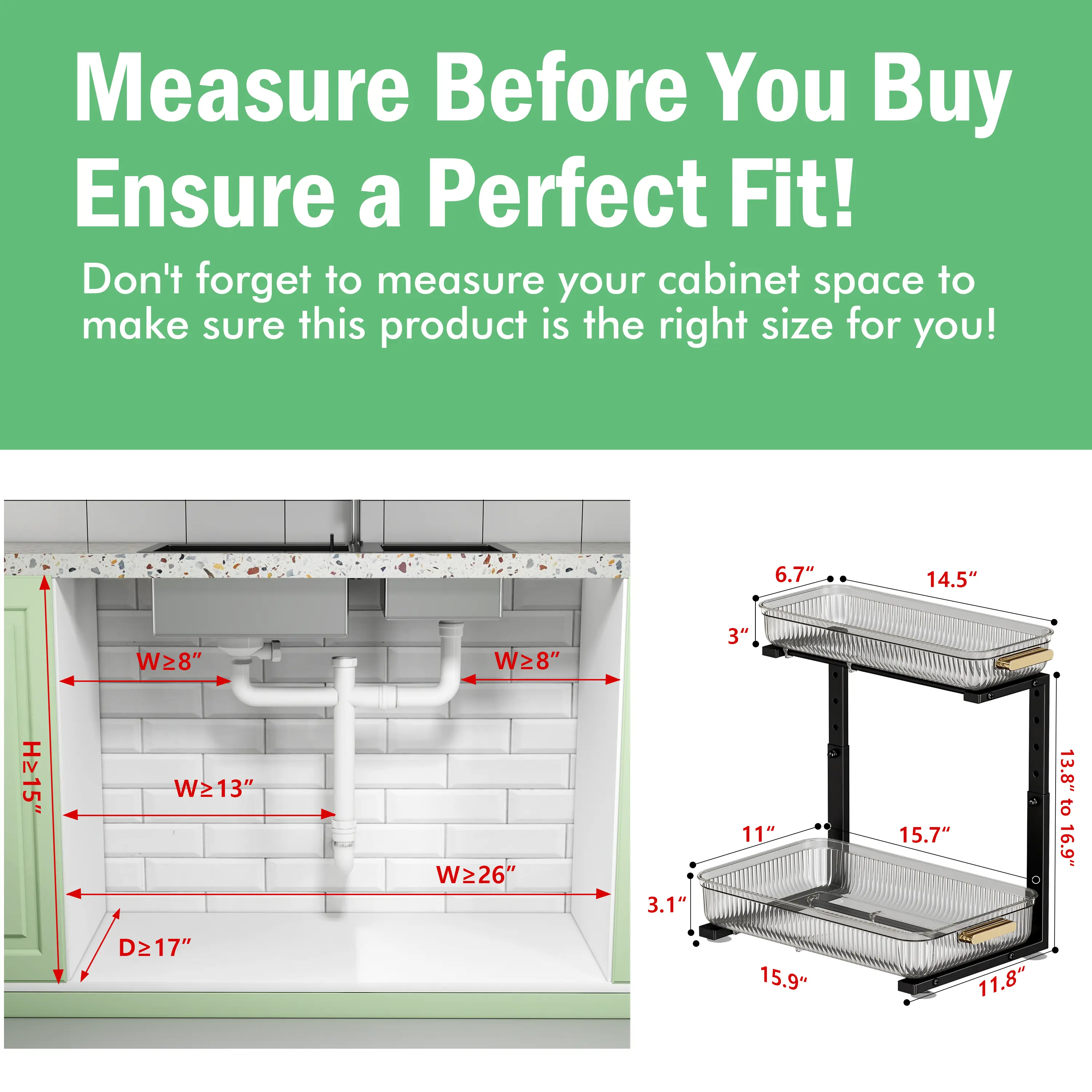 The image shows two organizers, one black and one clear, placed under a sink. They are designed to maximize space and declutter the kitchen.
