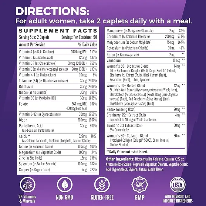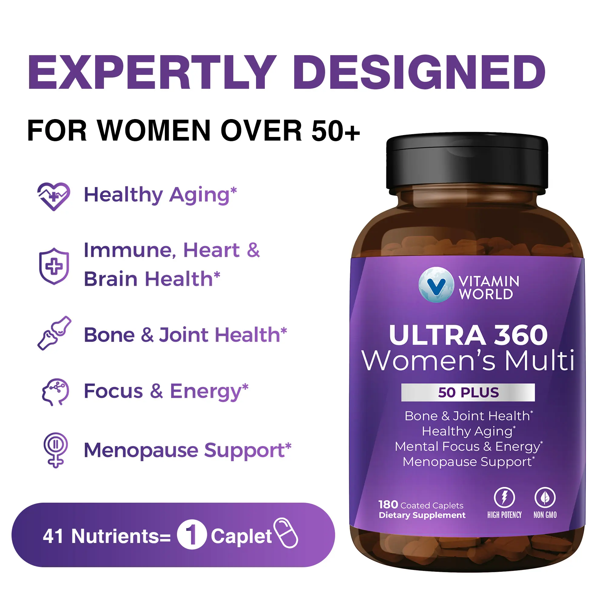 ·WELL-ROUNDED MULTI FOR WOMEN 50+: ULTRA 360 Women’s Multi 50+ features 25 key vitamins and minerals plus herbs including Vitamin A, C, D, E, B-complex, Biotin & Zinc for women's 50+ wellness support;* Women 50+ should take two caplets daily with a meal