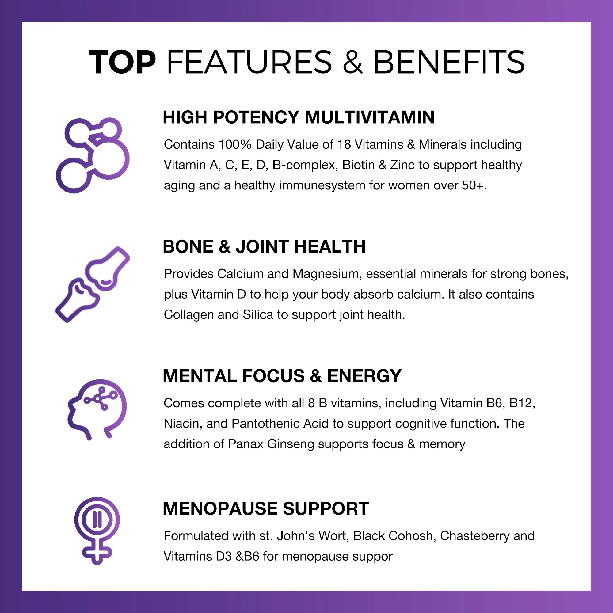 ·RECOVER THE ENERGY YOU LOST: Our multivitamin for women 50 Plus is specially formulated to provide essential nutrients that support bone & joint health, robust brain function, healthy aging and menopause support*