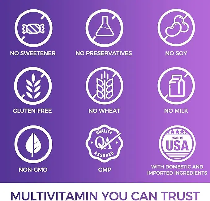 ·PREMIUM INGREDIENTS: Our multivitamin for women 50+ is non-GMO and free from Added Sweetener, Preservatives, Milk, Soy, Lactose, Wheat, Fish, Gluten, Eggs, Gelatin, Yeast, and it is thoroughly tested to ensure it meets our high quality and purity standards