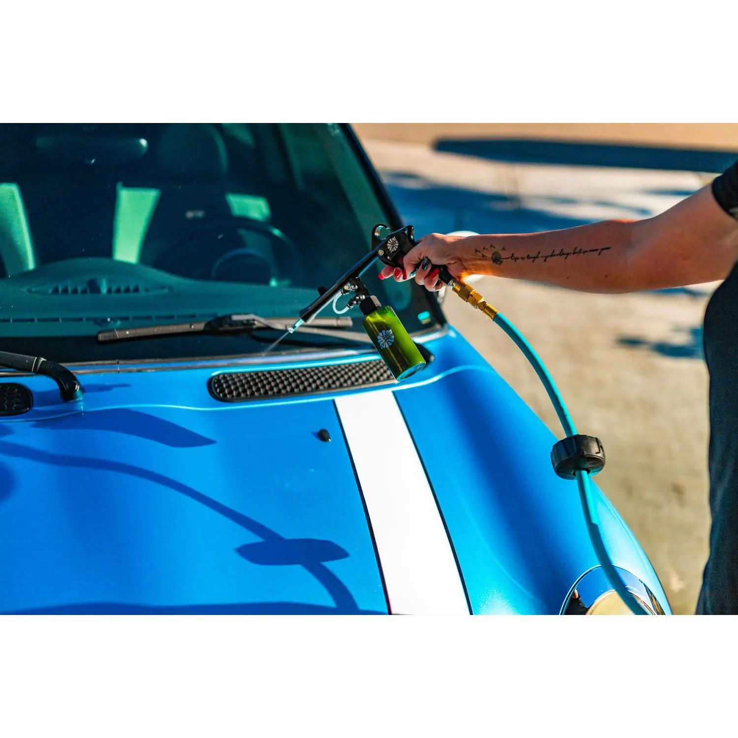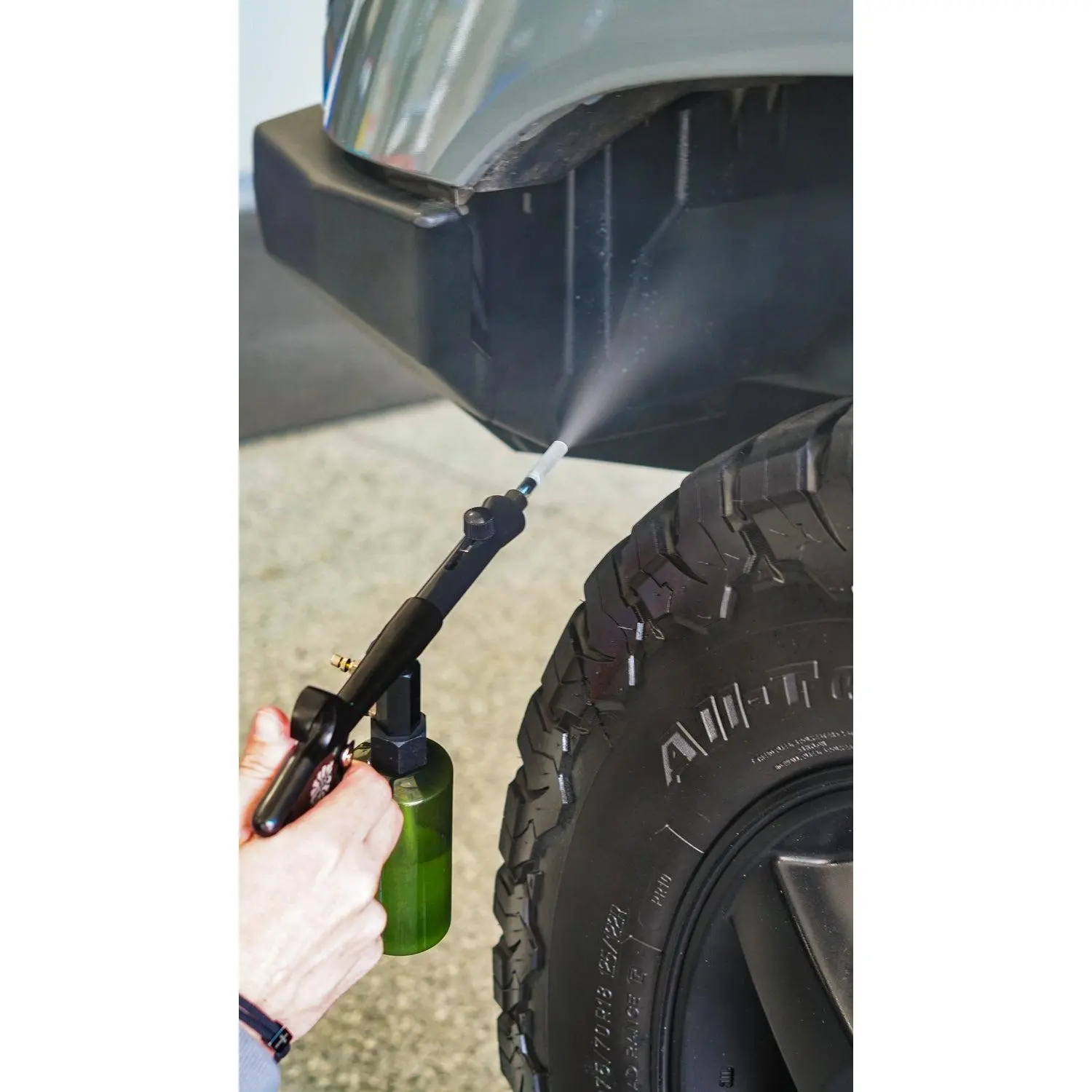 When the solution is sprayed using the Ultra Air Spray Applicator, the contents of the diluted mixture become atomized; this means the particles become so small, they are more easily and effectively able to attach to the vehicles surface.