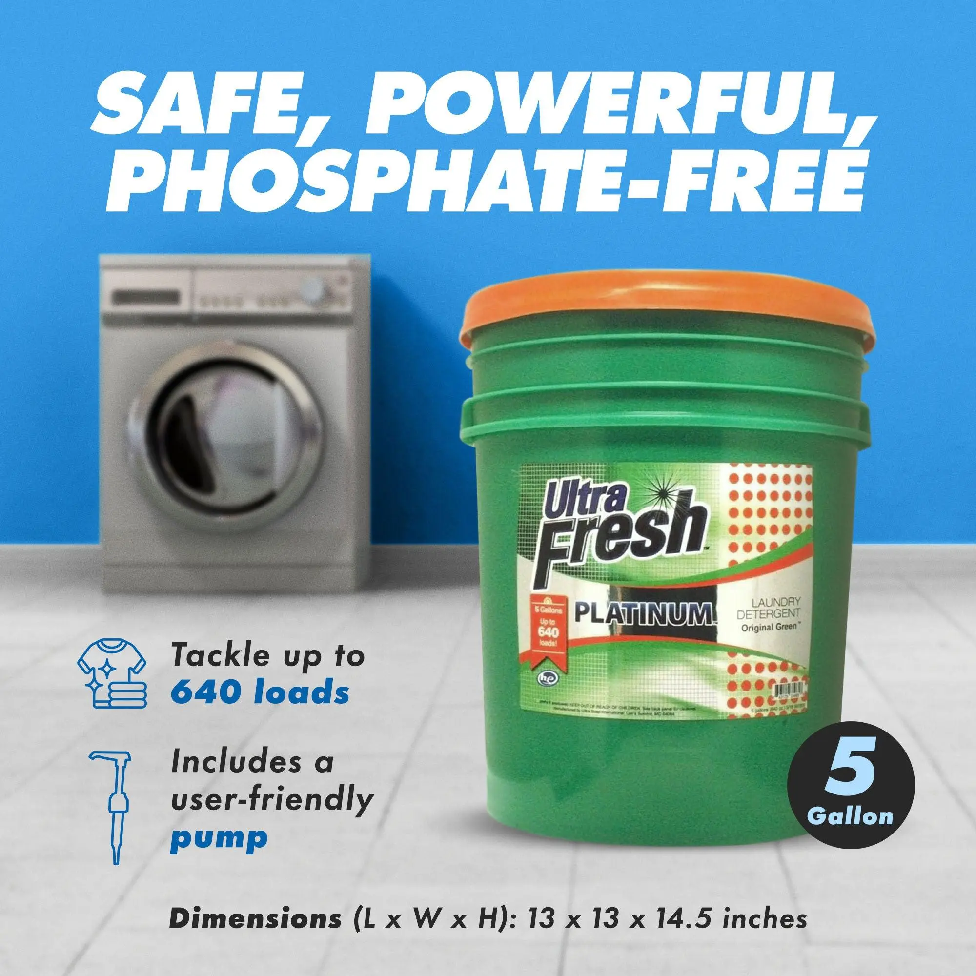 Experience a new level of cleanliness as this 3X Platinum 5 Gallon Original Green Laundry Detergent from Ultra Fresh combines cutting-edge technology with unparalleled cleaning power. Its unique formula goes beyond ordinary detergents, delivering a deep 3X cleaning power that removes tough stains and whitens and brightens your clothes like never before.Say goodbye to lingering odors with the potent odor eliminators and enjoy the confidence of knowing that your clothes look clean and smell irresistibly fresh, maintaining that just-washed fragrance for an extended period. Designed with efficiency in mind, this laundry soap is highly concentrated, allowing you to achieve remarkable results with smaller amounts. With the power to tackle up to 640 loads per 5-gallon bucket, this laundry detergent offers exceptional performance and unbeatable value. In addition to its outstanding cleaning capabilities, this detergent is certified as High Efficiency (HE), ensuring compatibility with all washing machines and septic systems. Rest easy knowing that your laundry routine is effective and safe for your appliances and the environment. This detergent also protects against harmful chemicals, containing no phosphates or bleach.Embrace this 3X Platinum 5 Gallon Original Green Laundry Detergent from Ultra Fresh, and let the fresh fragrance become an indelible part of your daily routine.