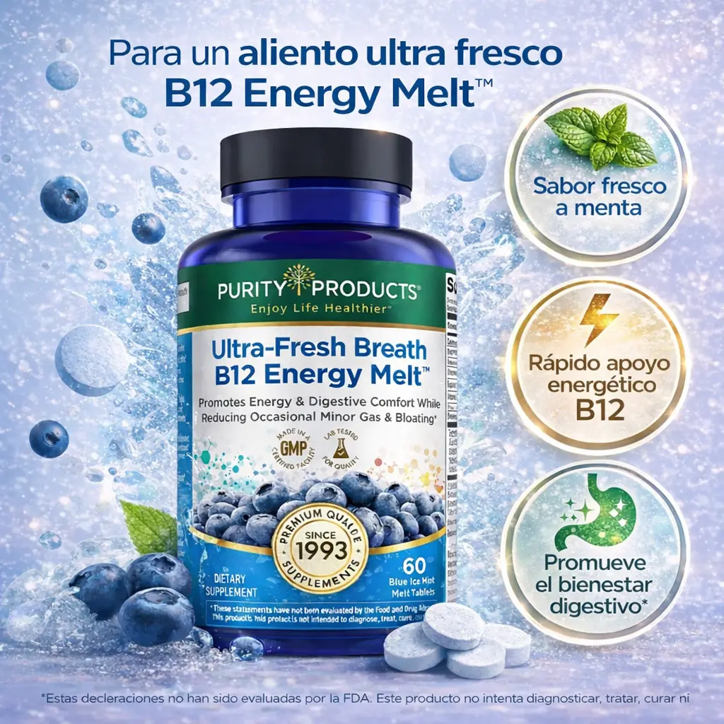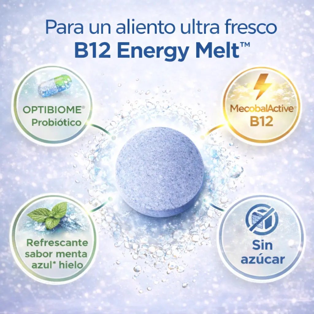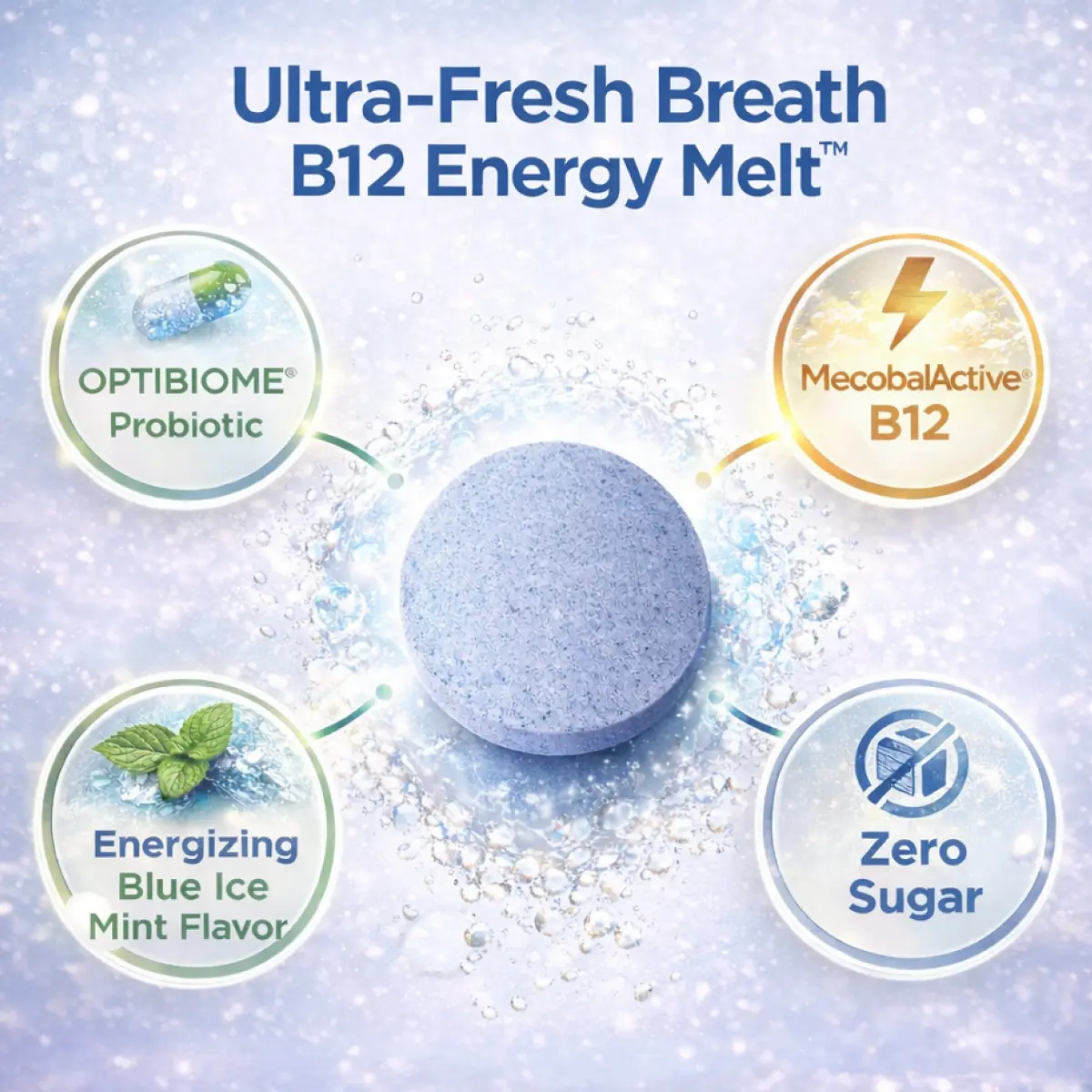 Ultra-Fresh Breath B12 Energy Melts - 1000 mcg de Metilcobalamina + Zinc, D3 y Biotina, 60 Tabletas de Disolución Rápida para Energía, Inmunidad, Confort Digestivo y Salud Oral, Sabor Menta