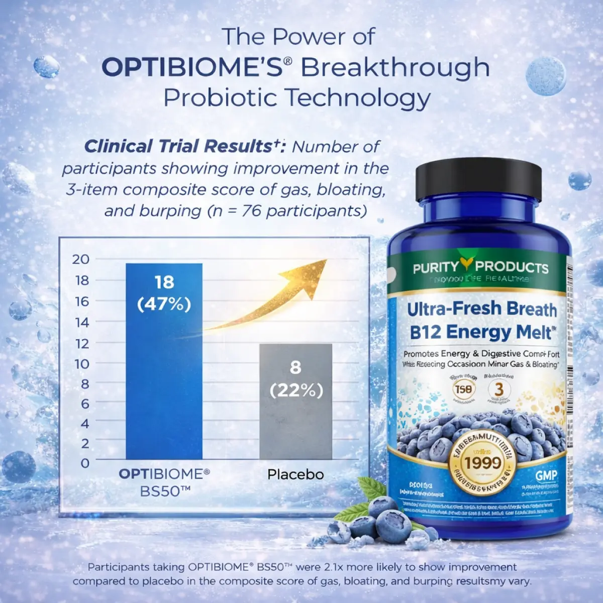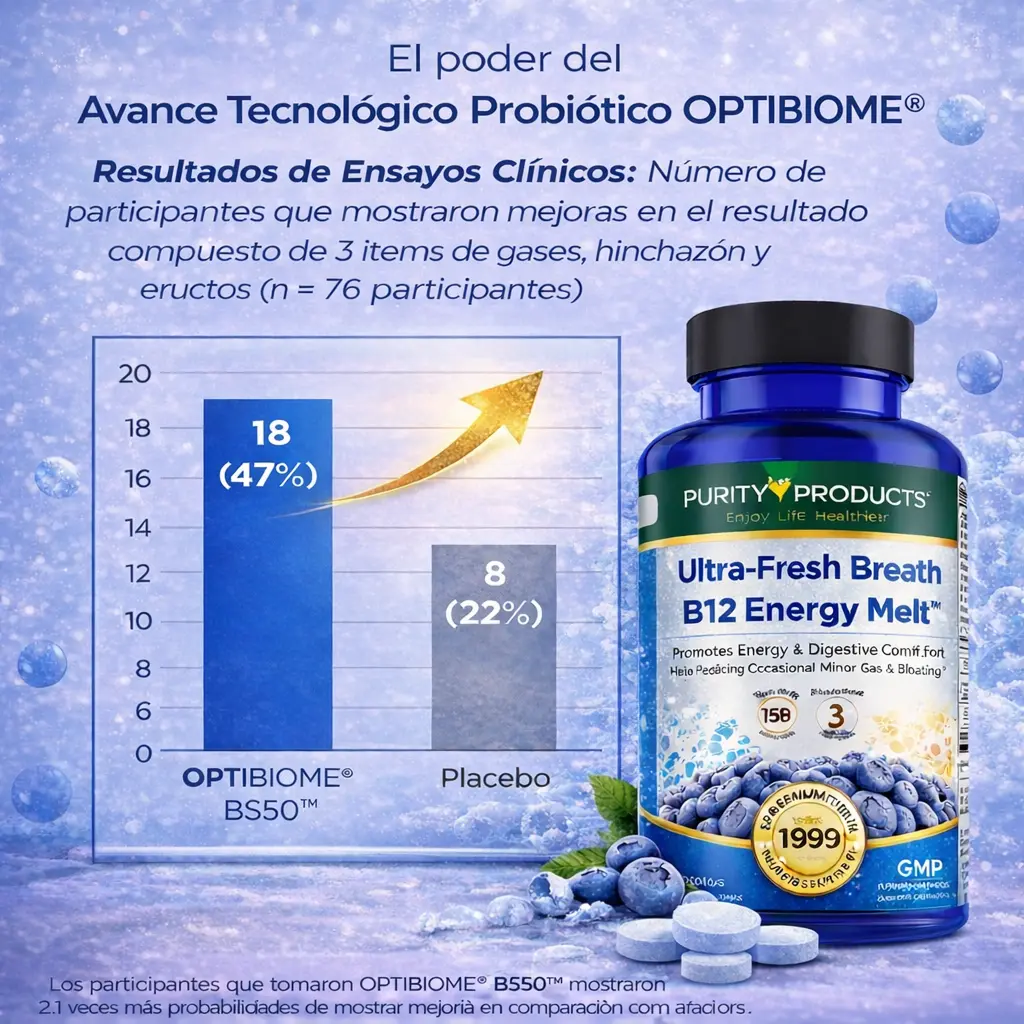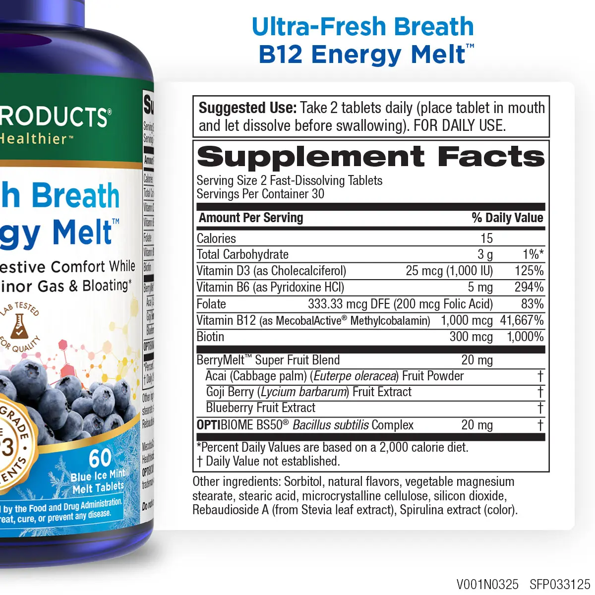 Ultra-Fresh Breath B12 Energy Melts - 1000 mcg de Metilcobalamina + Zinc, D3 y Biotina, 60 Tabletas de Disolución Rápida para Energía, Inmunidad, Confort Digestivo y Salud Oral, Sabor Menta