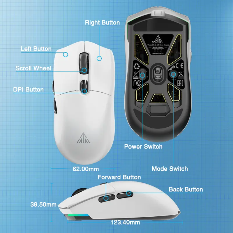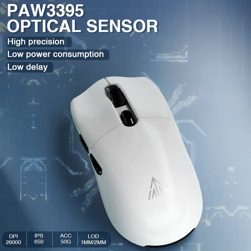 ·PAW3395 Optical Sensor:SM800 is a powerful gaming mouse with excellent performanc,equipped with PAW3395 sensor that is one of the most advanced optical sensors on the market,it has the advantages of high precision,low power consumption,low latency.SM800 supports 6 levels adjustable DPI up to 26,000,user's can setup different DPI according needs,it suitable for games, office and many occasions