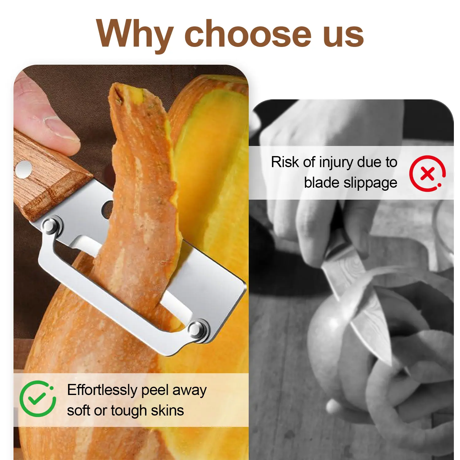 【Comfortable Wooden Handle】Solid wood handle feels comfortable and secure in your hand. The ergonomic shape helps reduce hand fatigue, even when peeling a lot of fruits or vegetables.