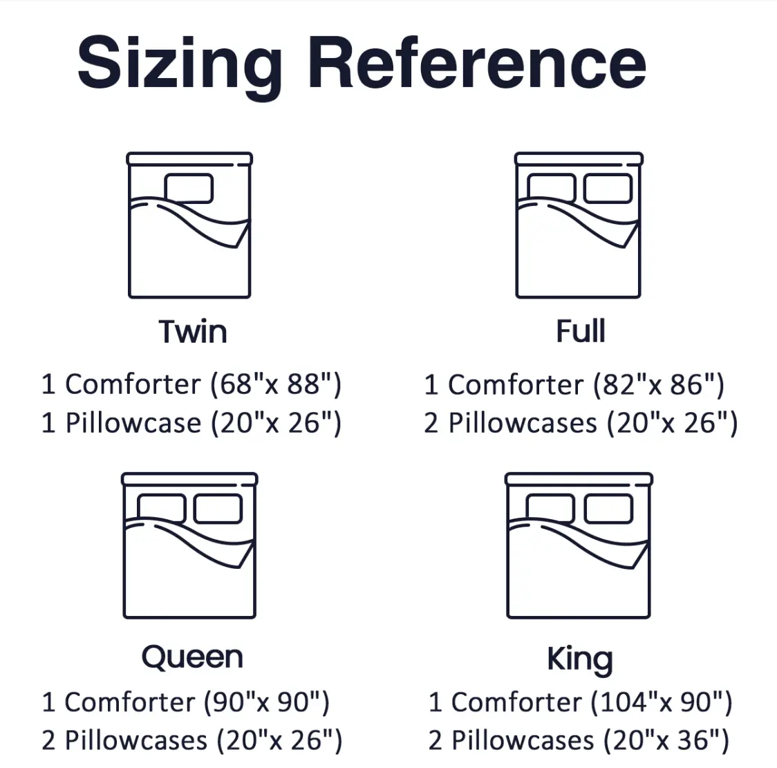 King size comforter measures 104x90 inches with 20x36 inches pillowcases 2 pack