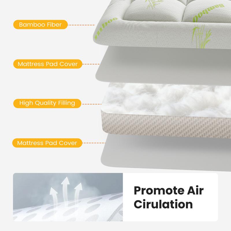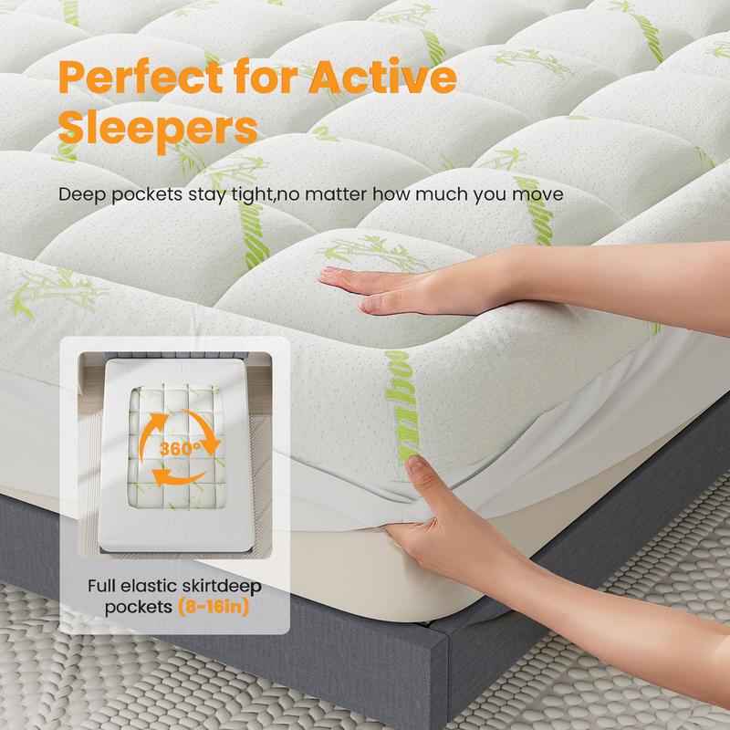 ·【Cool & Breathable for Restful Sleep】 Crafted from premium 40% bamboo viscose material and 60% polyester, ideal for sensitive sleepers.This bed cooling system wicks away heat and moisture throughout the night, ensuring a consistently cool and dry surface. Say goodbye to night sweats and hello to deep, restful sleep on our bamboo mattress topper.