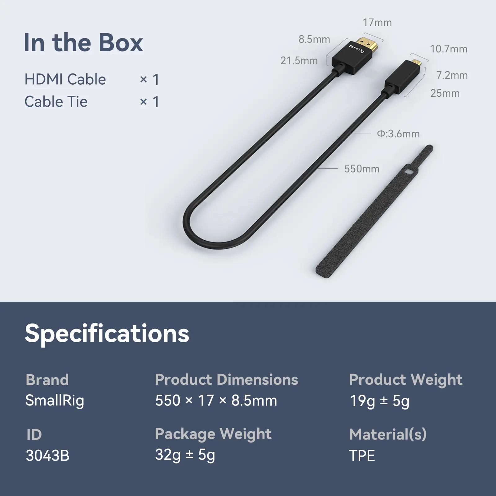 Ever struggled with bulky HDMI cables in tight shooting setups? Meet the SmallRig ultra-thin 55cm HDMI cable, your new best friend for clean, flexible connections. This slim cable is perfect for professionals and hobbyists using GoPro Hero 5, 6, 7, Sony A7 series, or FUJIFILM X-T3/T4 cameras. It delivers crisp 4K video at 60Hz with HDR thanks to HDMI 2.0 support and an 18Gbps bandwidth. The cable’s 3.6mm diameter and TPE construction make it super flexible and durable, ideal for cramped spaces without sacrificing performance. Plus, it comes with a cable tie to keep your gear organized and tangle-free. Whether you're shooting on location or in the studio, this cable keeps your setup sleek and hassle-free. Ready to upgrade your video connection? Grab this ultra-thin HDMI cable and enjoy smooth, high-quality footage every time.