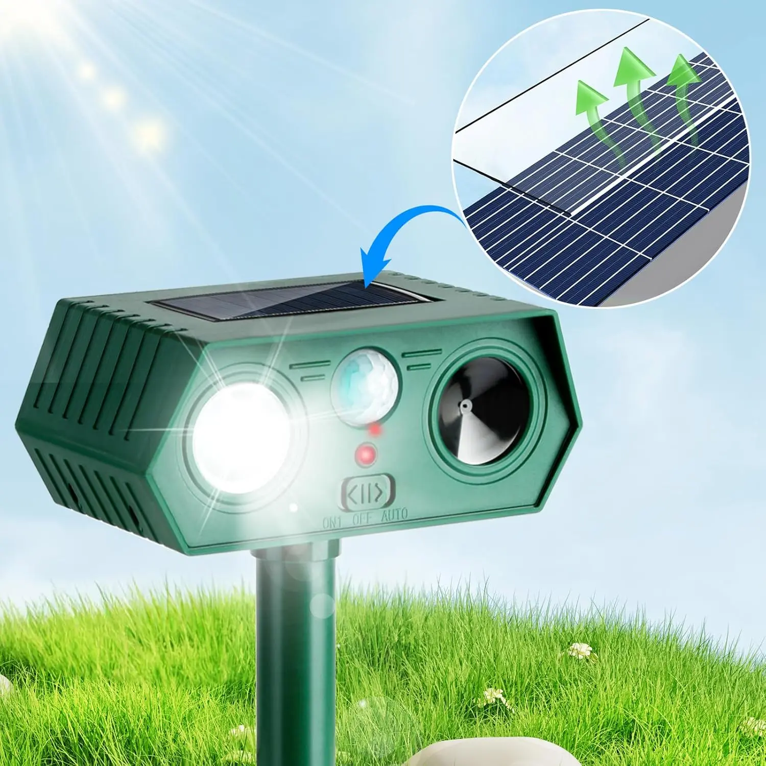 ·【Solar Fast Charging & Waterproof】High photoelectric conversion solar panel on its top, it can be charged by solar panel in the sun.Additionally, once turned ON, when the PIR sensor detects motion, red-LED light will be lit up.If no new movement was detected, the repeller will return to stand-by mode, which can save more energy.