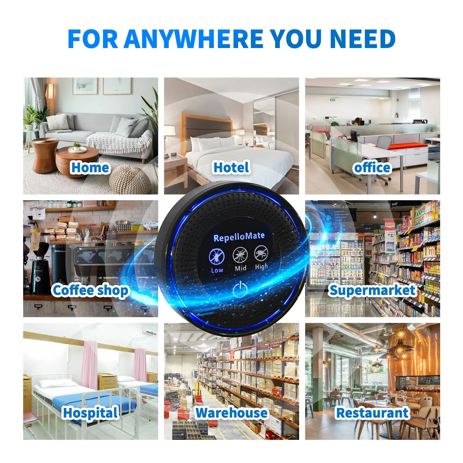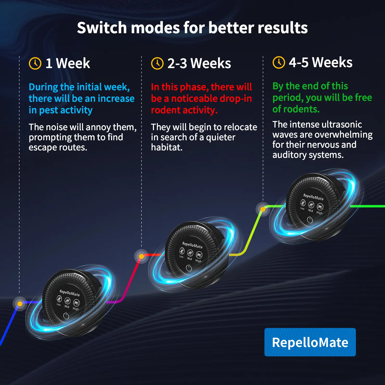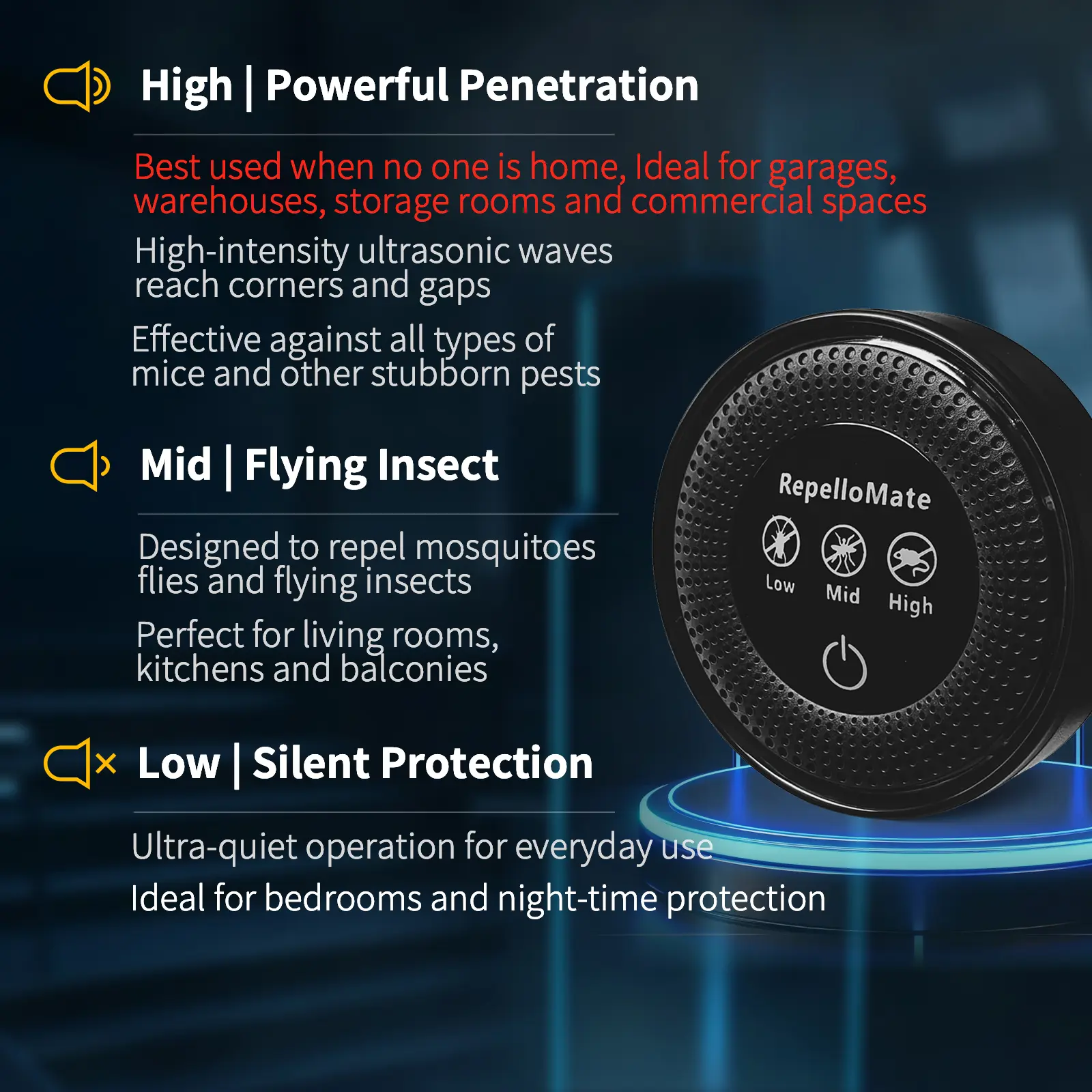 Advanced ultrasonic technology for comprehensive pest control throughout your home. Most pests will be repelled within approximately 2-4 weeks of continuous use. Features 3 adjustable modes—low, medium, and high—to meet all needs in both household and commercial settings.