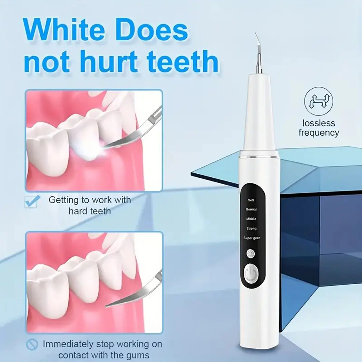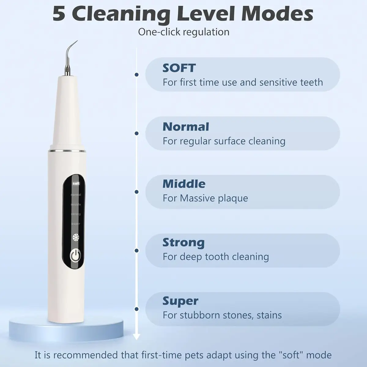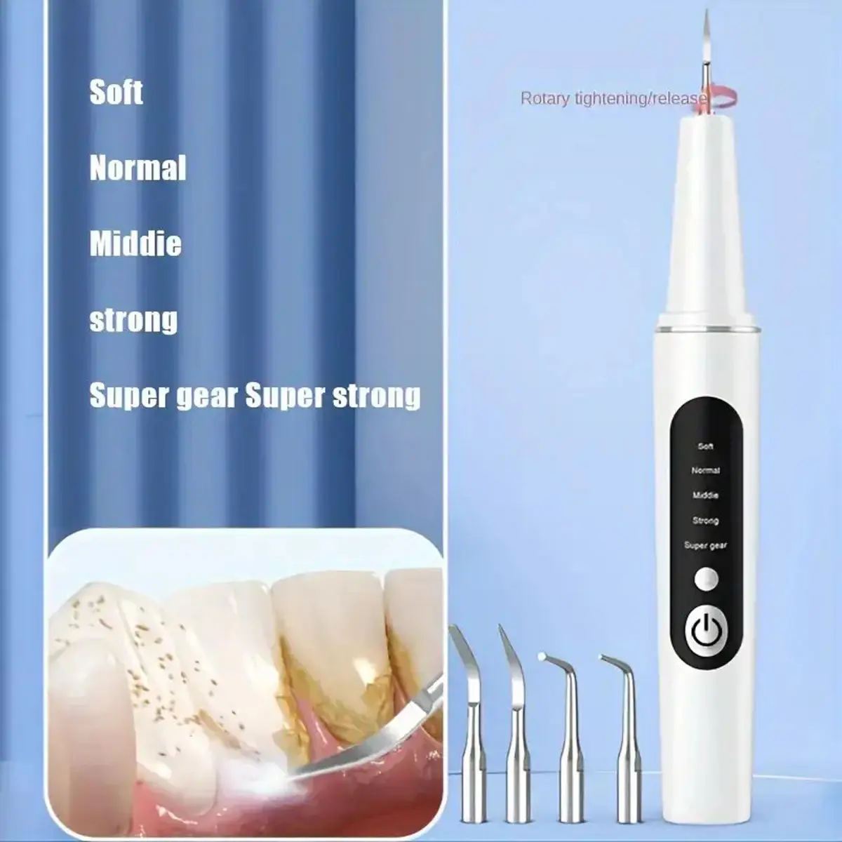 Ultrasonic Tooth Cleaner 🌟- Intelligent Technology: Utilizes the latest ultrasonic technology to remove plaque, calculus, and tartar effectively.- Safe and Scientific: Ensures dental health without harming teeth.- Adjustable Modes: Five modes: soft, comfortable, standard, strong, and super strong.- Initial Use: Start with the soft mode for the first time.