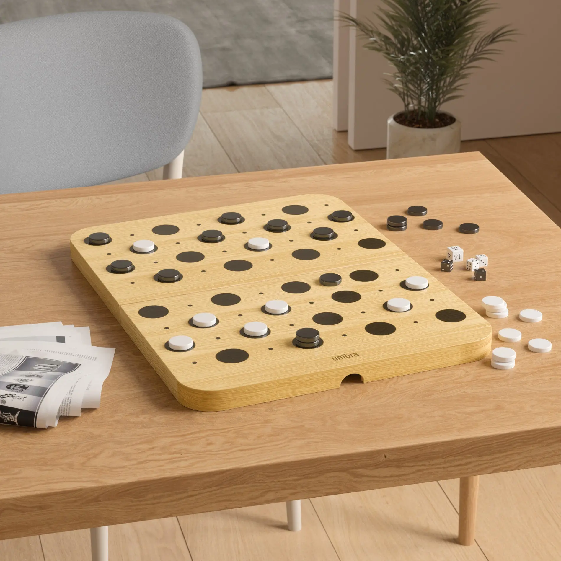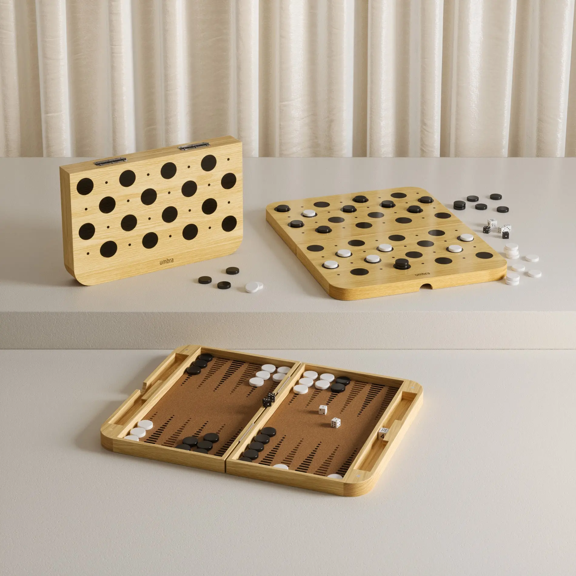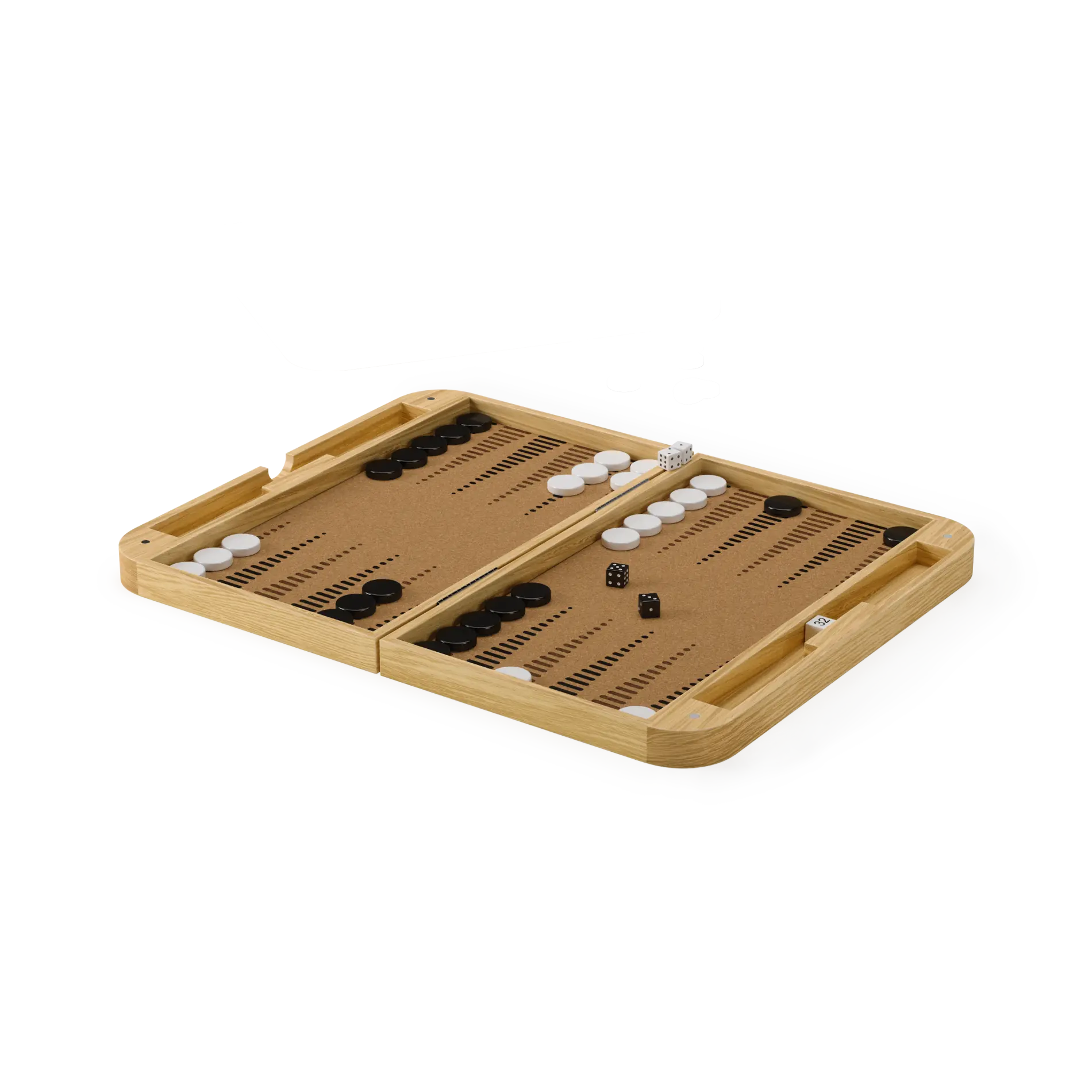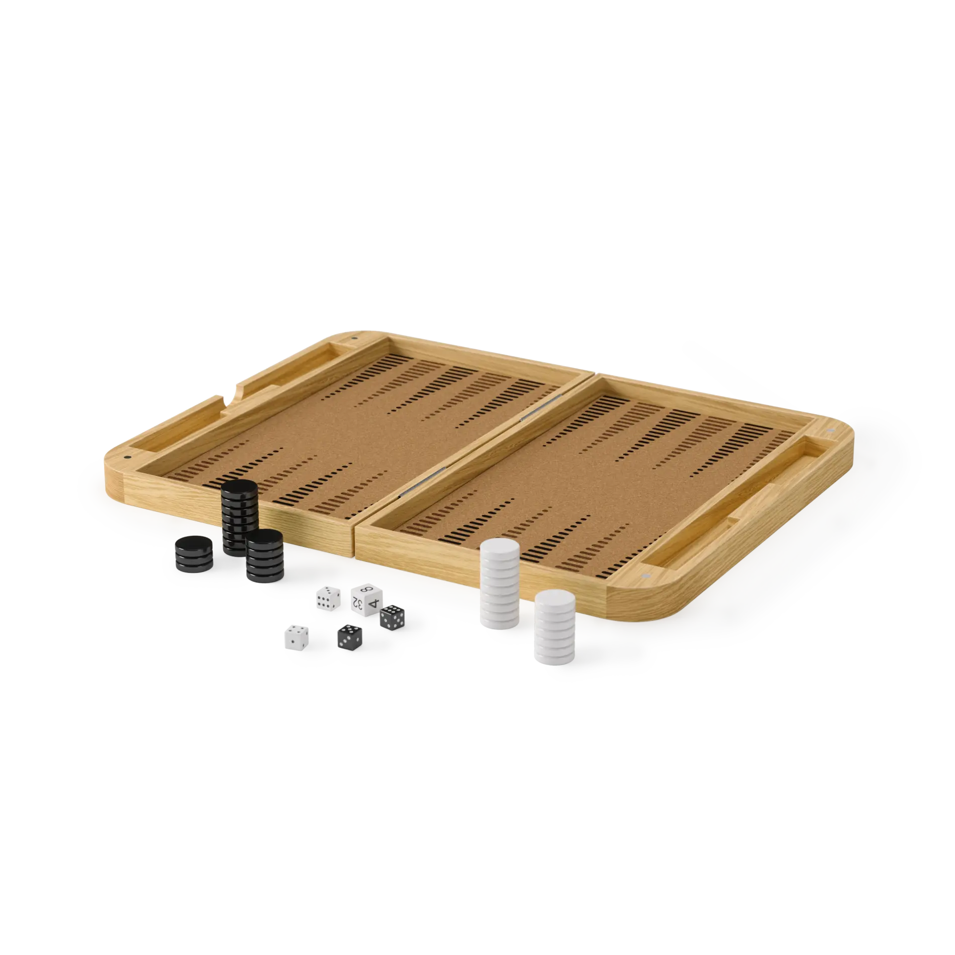 Made from Ashwood and cork, Blitz is both sustainable and beautiful. The outer case offers a classic checkerboard, while the interior provides a backgammon board. This thoughtful design ensures durability and aesthetic appeal.