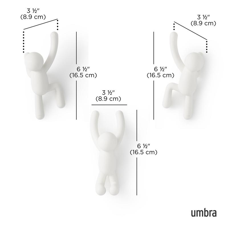 Add a dash of whimsy to your space with the Umbra Buddy Wall Hooks, a set of three wall-mounted hooks featuring the playful Buddy character in various climbing positions. Perfect for organizing coats, bags, accessories, and more, these hooks double as eye-catching wall décor when not in use.