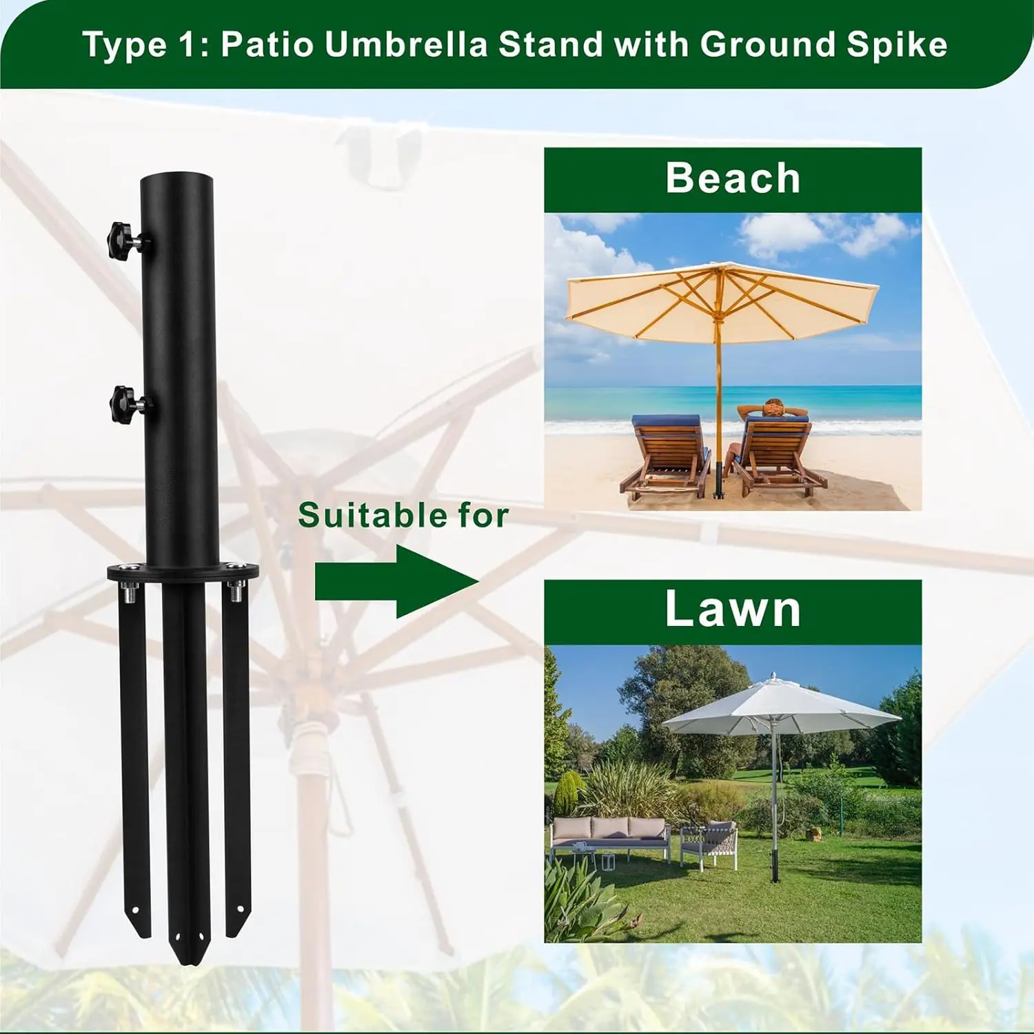 One Product Three Uses - The upgraded design inground umbrella base consists of two parts, including a base and ground stake umbrella stand, and can be used in three different.The umbrella holder can be used on concrete floors, the ground stake design can also be inserted into lawns, and the included spacer can also be used on.One product for multiple usesAdjustable Knob-There are two adjustable knobs on the inground umbrella stand, suitable for umbrella poles with a diameter of 1-2 inches, insert the umbrella into the umbrella tube, you can adjust the tightening according to the size of the umbrella poles, the loosening of the poles and tilting of the umbrella frameDurability - The umbrella base made of, the whole completely covered with black anti-rust powder coating, high hardness, hard and stable structure, not to break and deform.Drainage holes at the bottom to prevent water accumulation, prolong the service life, not to rust, applicable toWide Application - Umbrella base can be installed on most surfaces, can safely lock your parasol, flagpole, windward pole, umbrella sun rope pole, camping tent pole, compatible with poles to 1.9inch (4.8cm) in diameter.for decks, docks, beaches, patios, lawns and moreto install- The deck umbrella stand comes with three sets of mounting accessories, no need to buy additional mounting accessories to get three mounting methods, can be installed in a few minutes, it's your choice for shade. And the umbrella stake anchors won't hurt your lawn and won't your grass growth