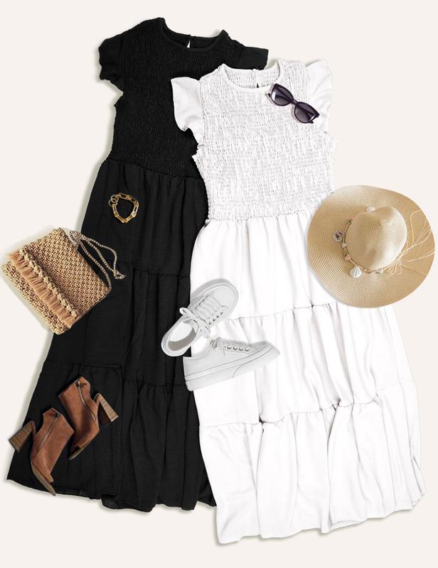 5. UMIPUBO Summer Flutter-Sleeve Ruched Layered Maxi Dress Casual Womenswear Summer Basic Minimalist