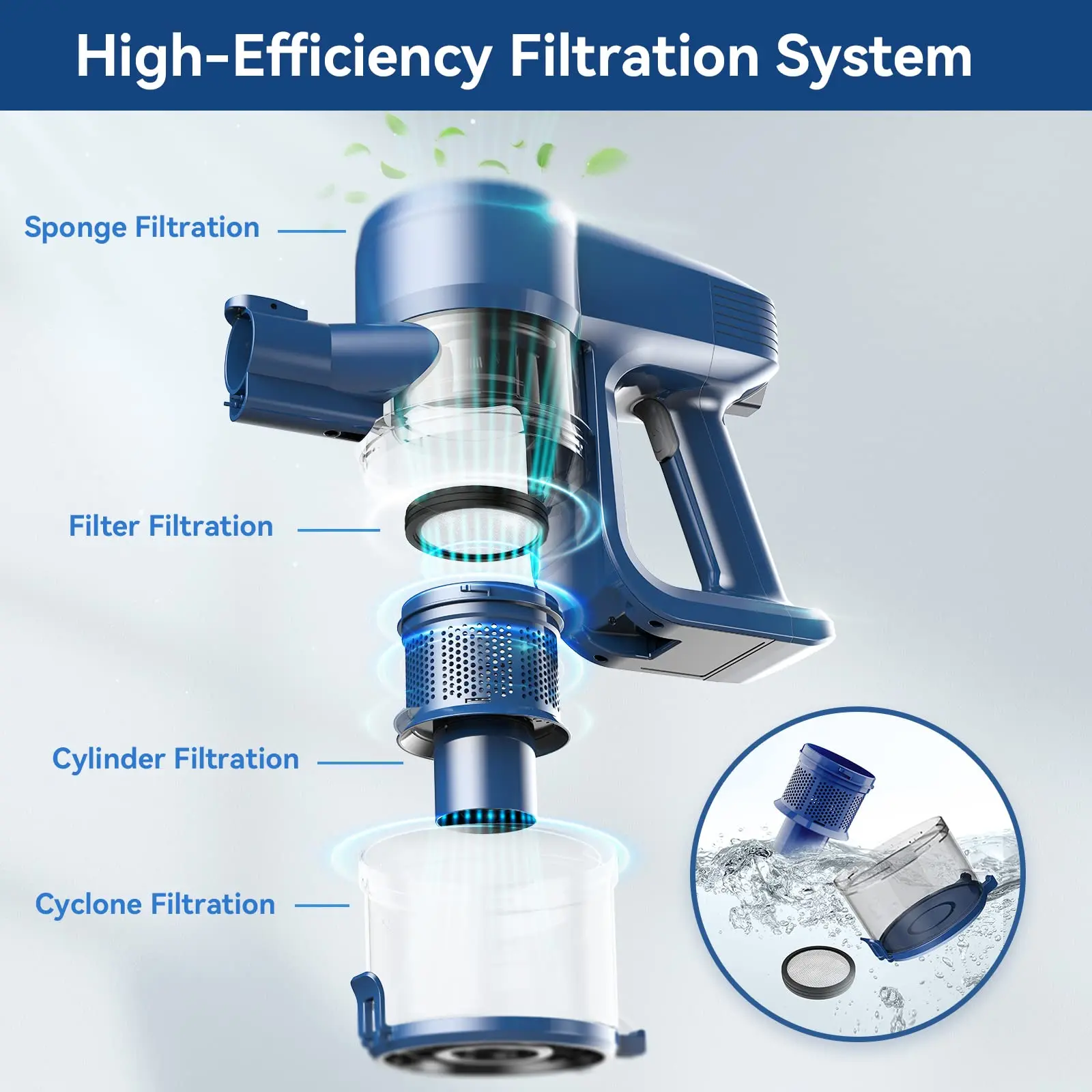 With a 6-cell 2200mAh rechargeable battery, this cordless vacuum offers impressive runtime. Lasting up to 40 minutes in standard mode and 20 minutes in max mode, it enables uninterrupted cleaning throughout your home. Its wall-mount design ensures convenient storage and space-saving.
