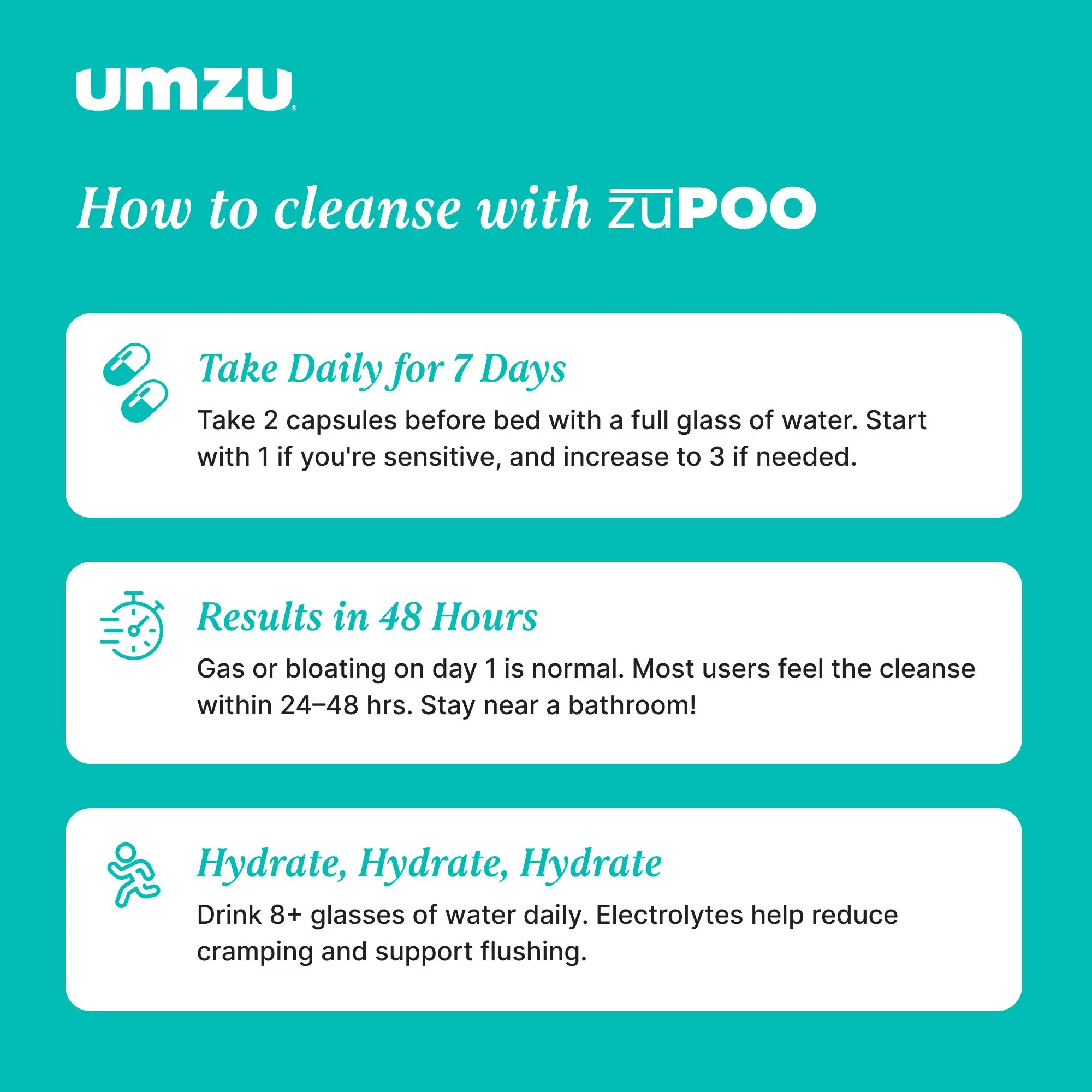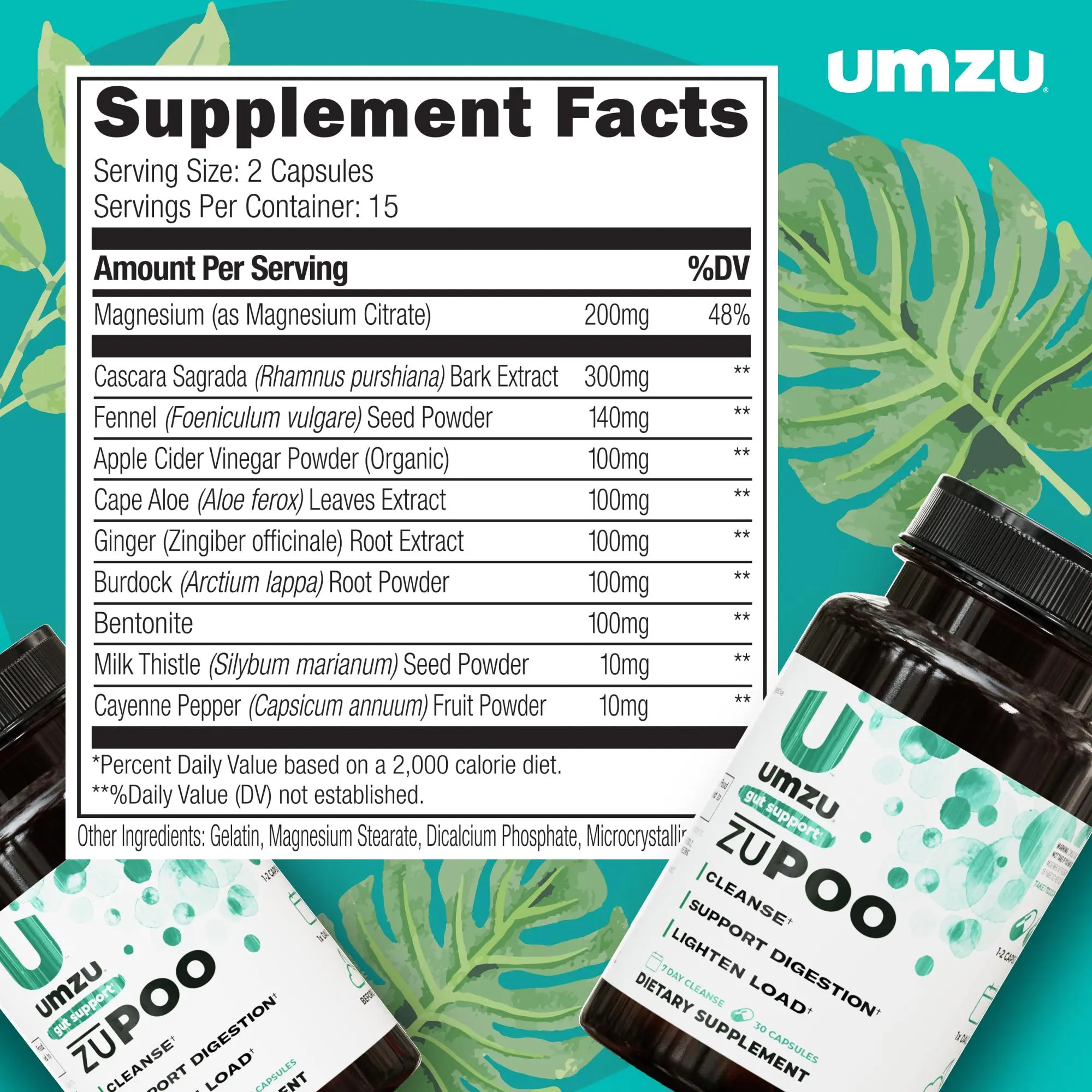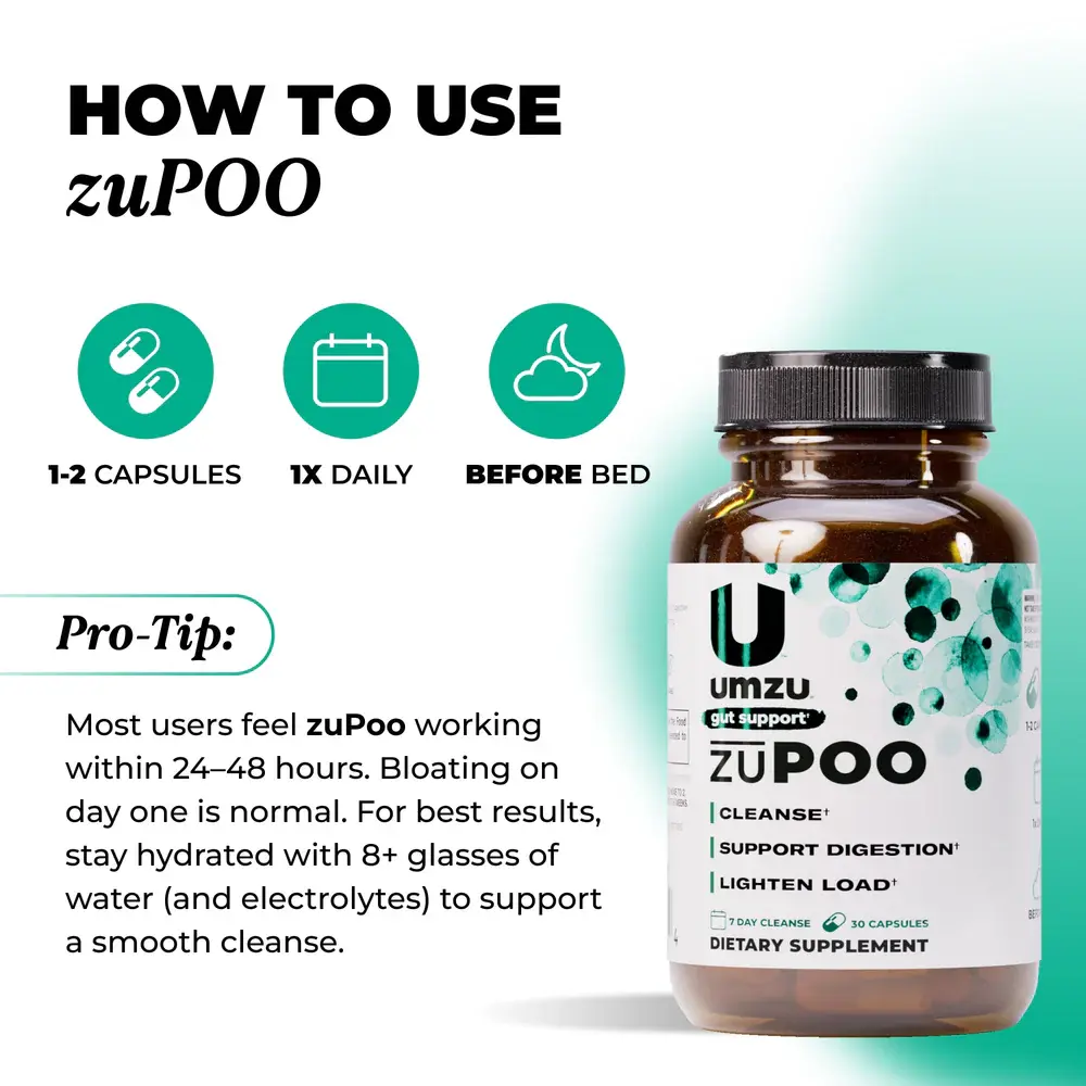 zuPOO by UMZU is a herbal gut cleanse supplement designed for adults who feel occasionally bloated, “backed up,” or heavy and want short-term support for digestion and regularity. zuPOO by UMZU is a herbal gut cleanse supplement designed to support digestion and help flush waste from the digestive tract. Made with 10 carefully selected ingredients — including Magnesium, Cascara Sagrada, and Bentonite Clay — this gentle formula helps support regularity and relief from occasional bloating and “backed-up” feelings as part of a short gut-cleanse routine.