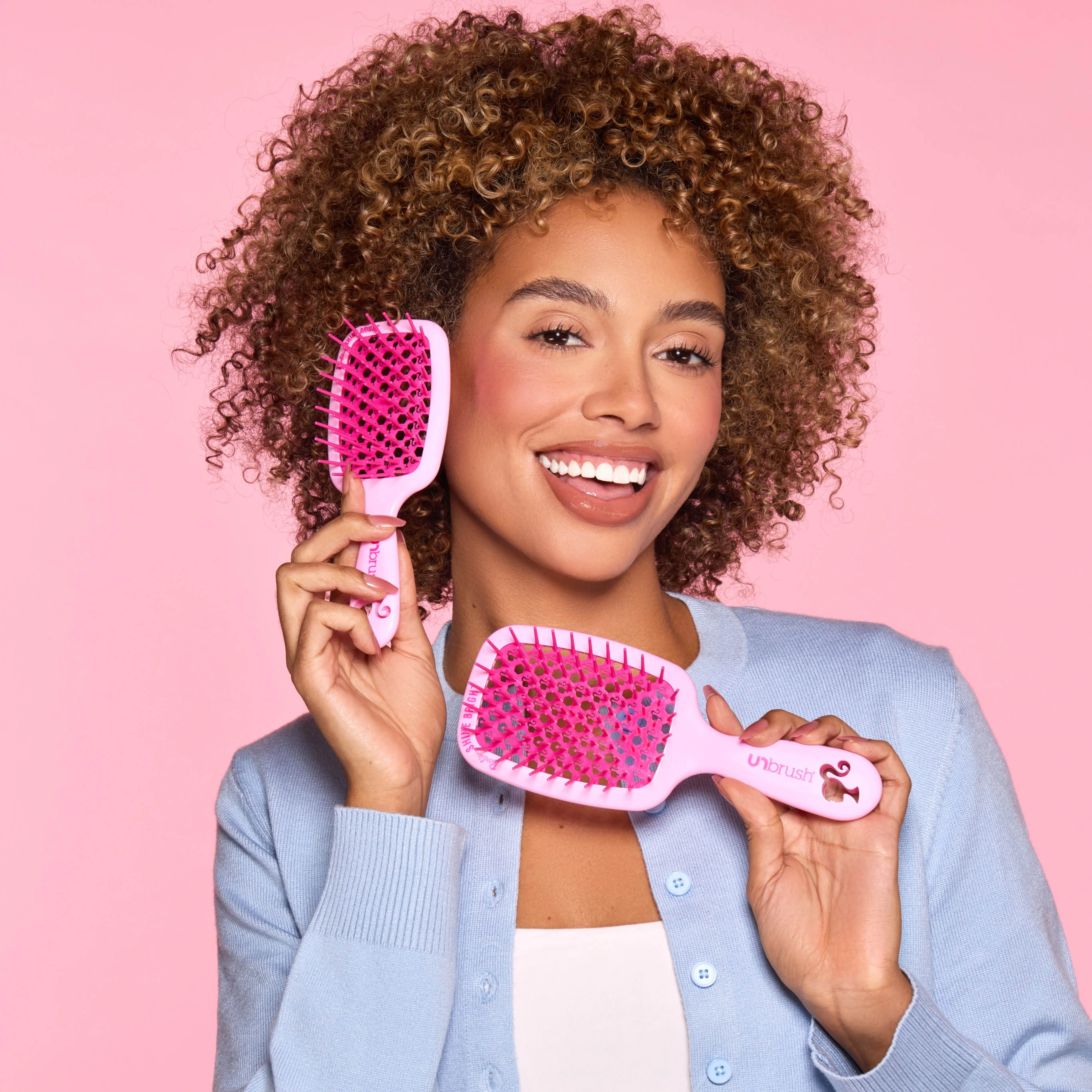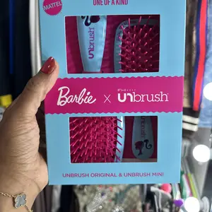 UNBRUSH Barbie duo set is amazing. It's super cute, with tiny details, the whole esthetic is a vibe. Glides through hair like no other. Doesn't pull, Doesn't rip. Great quality. Best hair brush I've ever bought