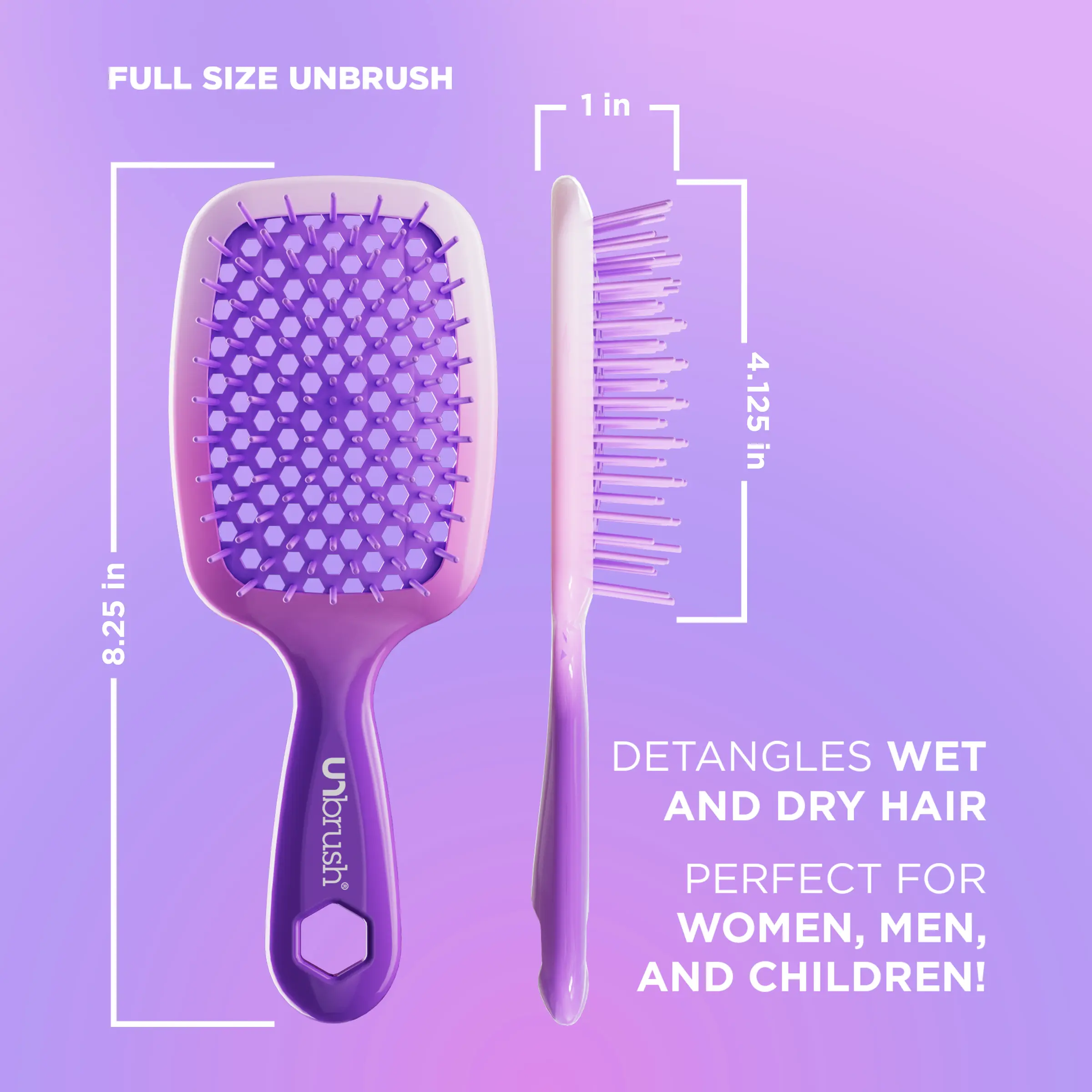 UNbrush gently yet thoroughly extracts knots and tangles from even the most unruly hair, painlessly and effortlessly. Featuring the perfect blend of 105 dual length bristles, combined with an ultralight high performance handle, UNbrush helps reduce styling time and prevents hair from catching. Great for wet or dry hair.
