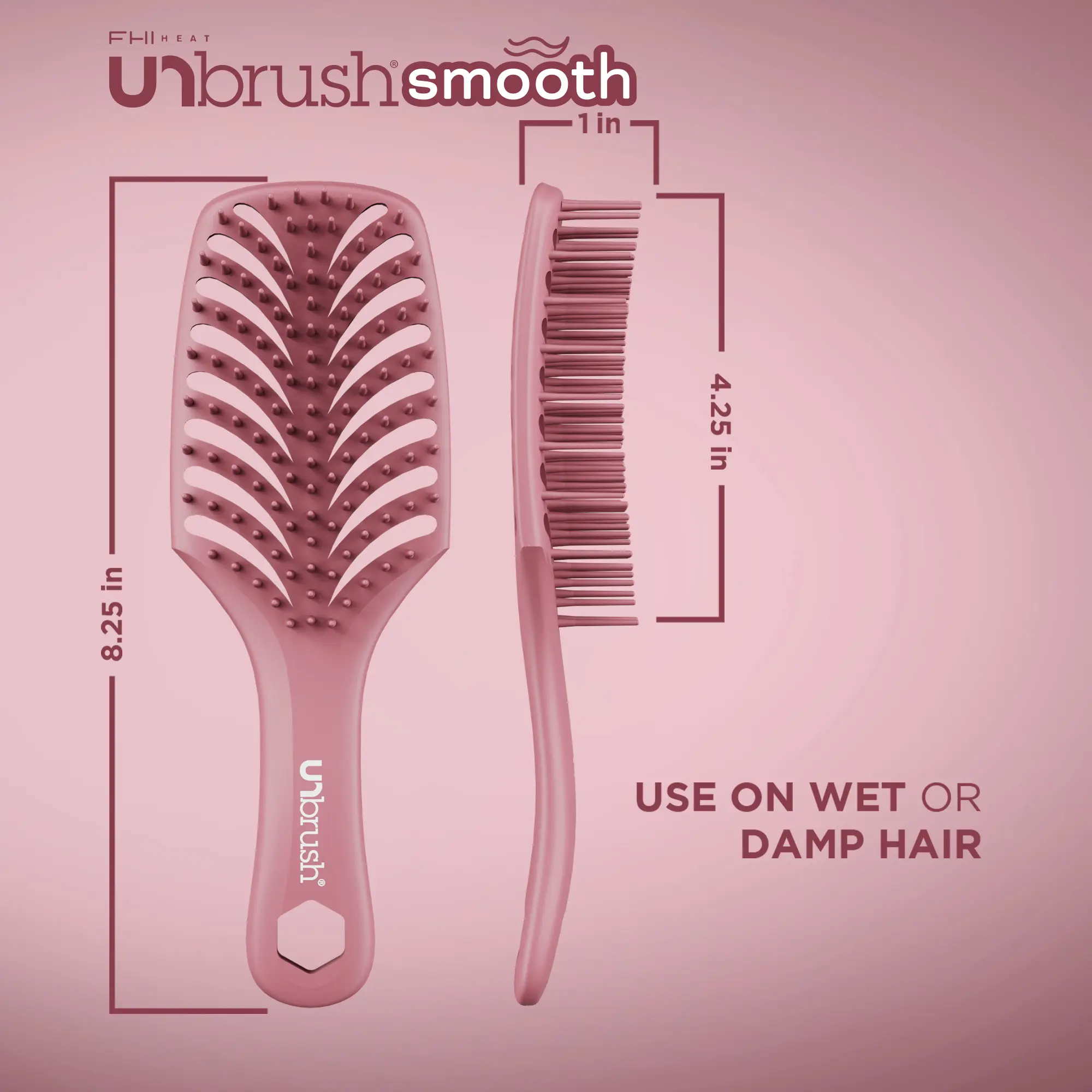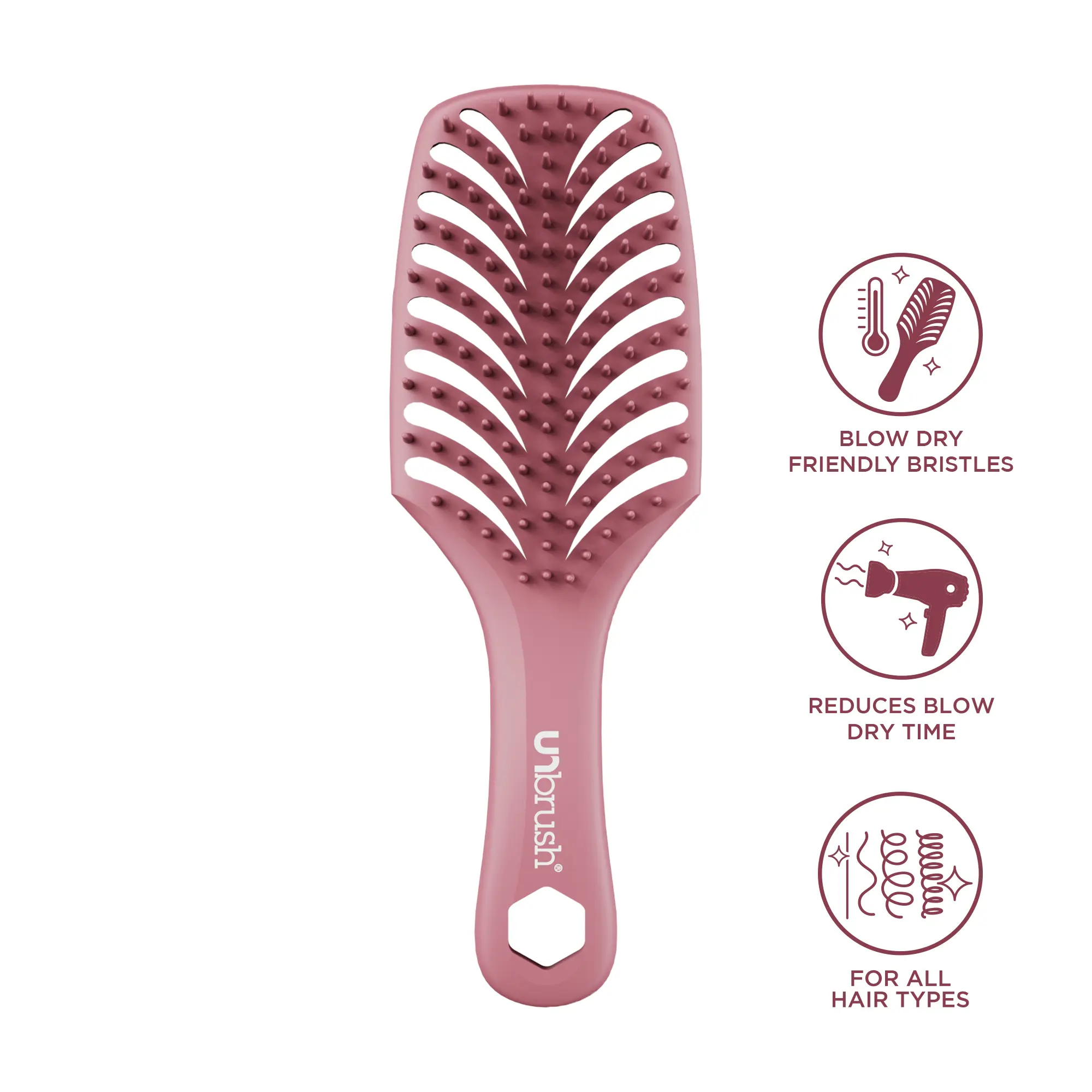 Introducing UNbrush Smooth - your go-to brush for smooth styling while blow-drying. With a sturdy base and a backless, vented cushion, UNbrush Smooth is designed for faster blow-drying. UNbrush Smooth features ThermaProof blow-dry friendly bristles that gently grip each strand, helping to reduce frizz, boost shine, and create a smooth finish as you dry.