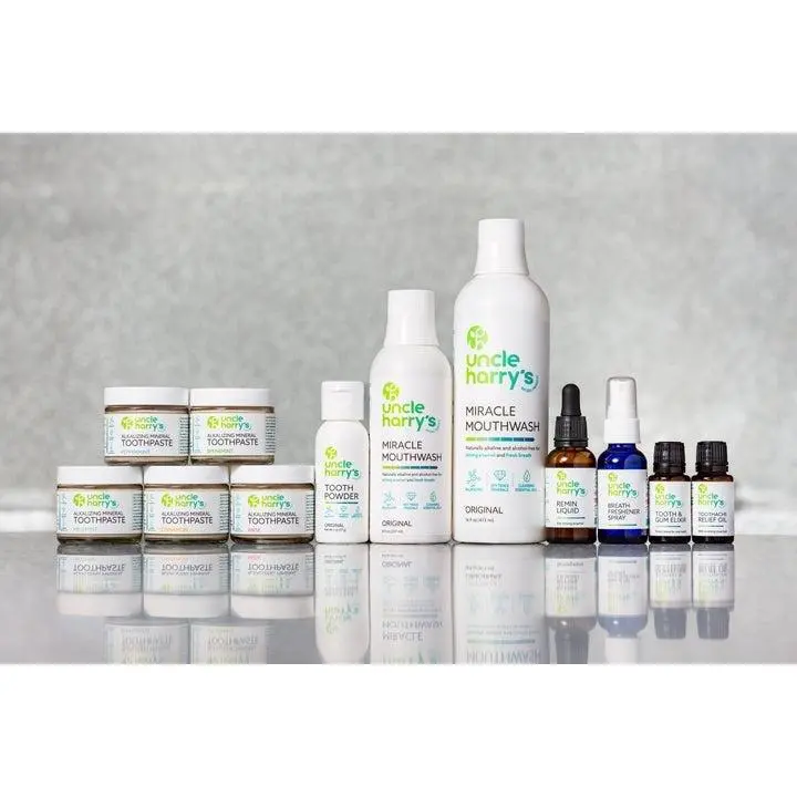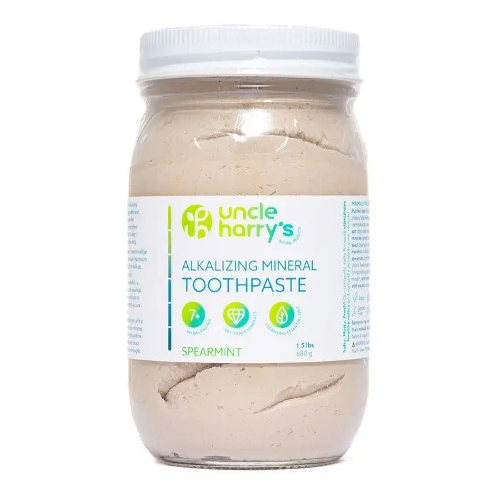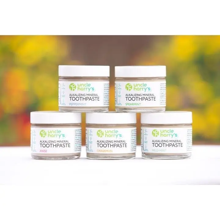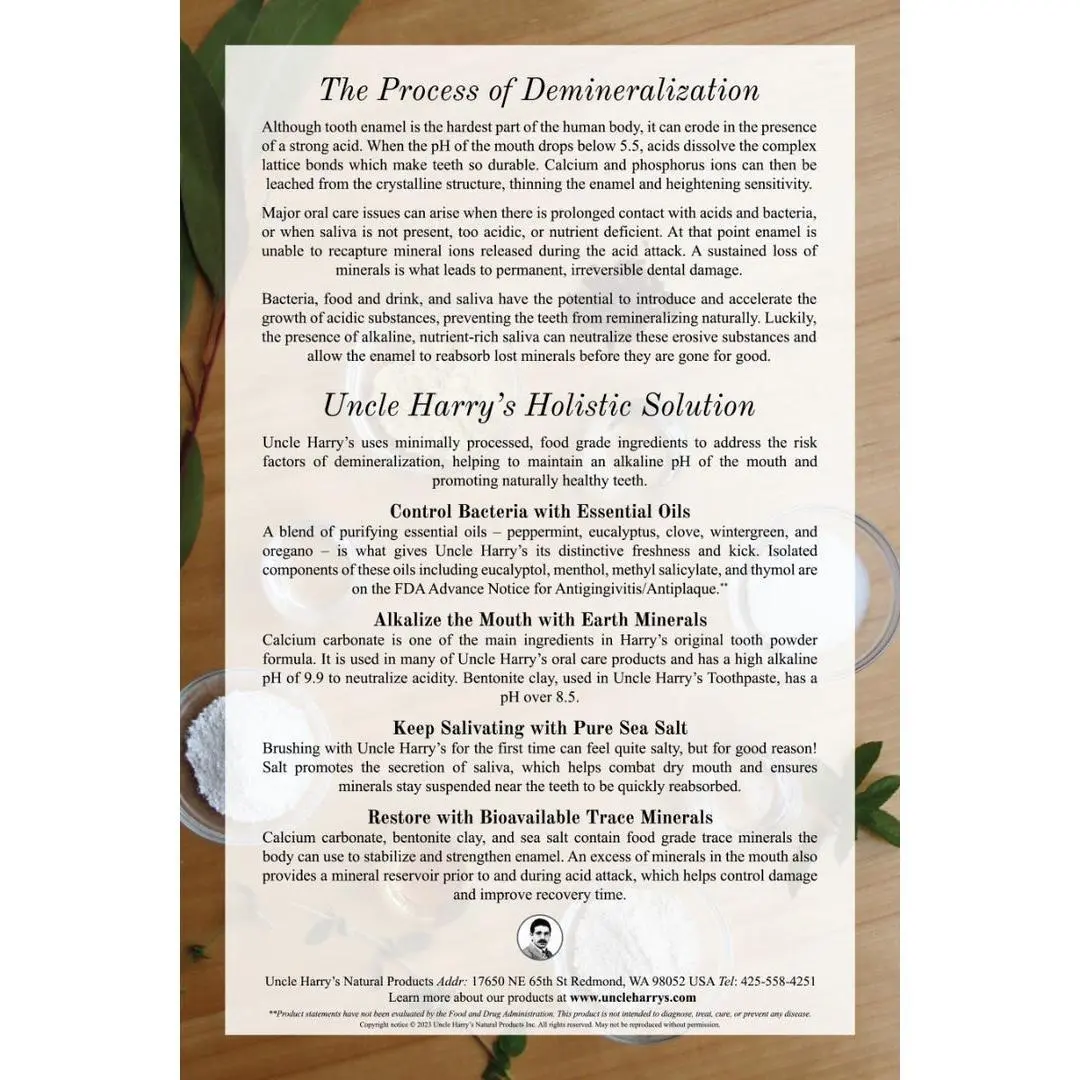 Uncle Harry’s Toothpaste encourages remineralization of tooth enamel by neutralizing acids and bacteria, supplying calcium and magnesium to strengthen teeth, and promoting an alkaline pH.