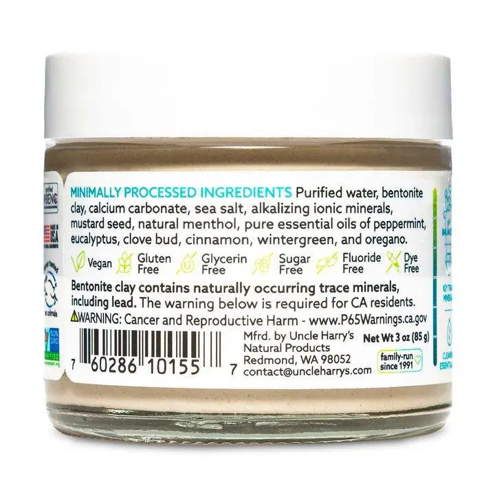 Minimally processed ingredients: Purified water, bentonite clay, calcium carbonate, sea salt, alkalizing ionic minerals, mustard seed powder, natural menthol (Mentha arvensis), essential oils of spearmint (Mentha spicata), peppermint (Mentha piperita), eucalyptus (Eucalyptus globulus), clove bud (Eugenia caryophyllus), wintergreen (Gaultheria procumbens), and wild oregano (Origanum vulgare).