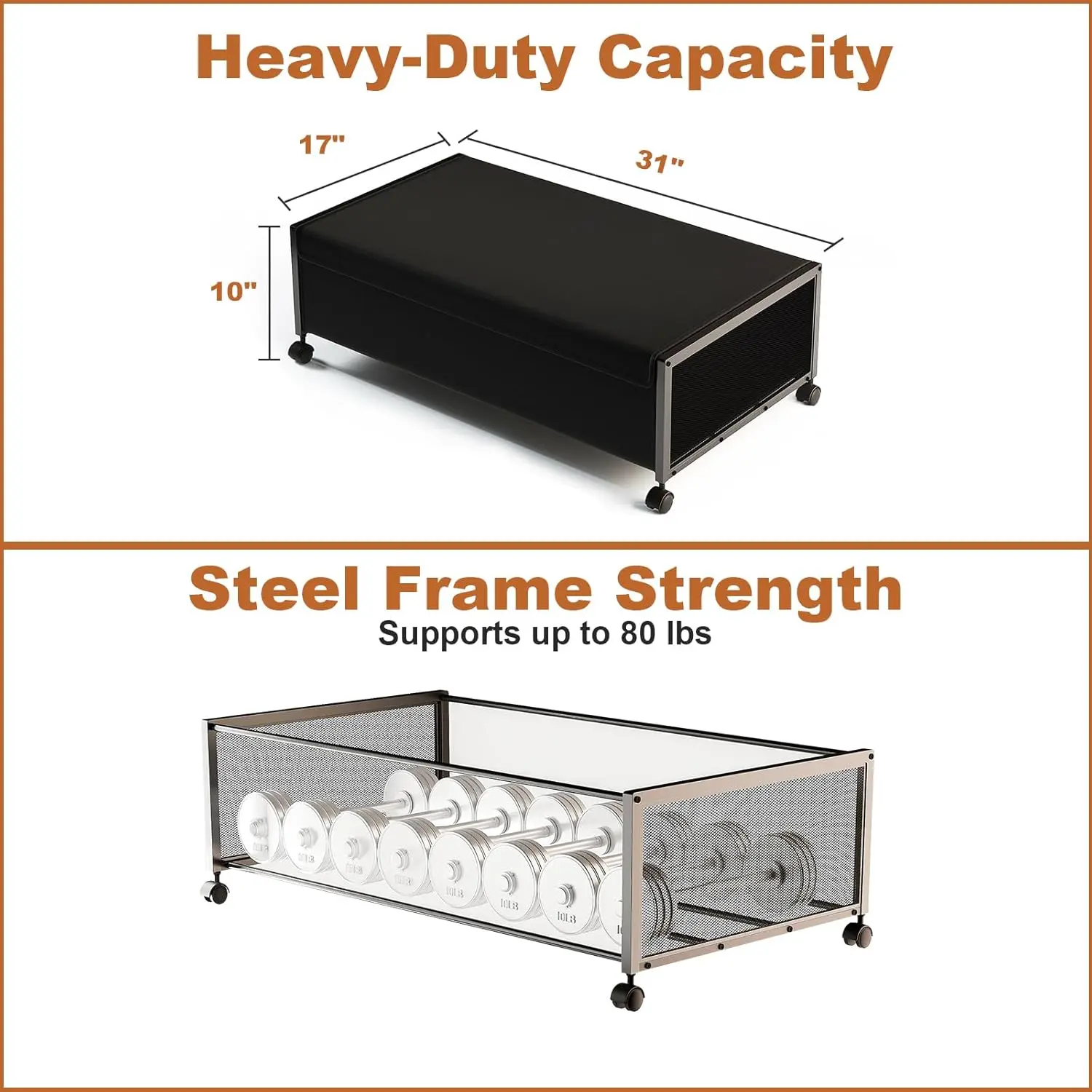 METAL CONSTRUCTION: our under bed storage drawer is designed tructure with Iron pipes and plates and can loads 80LB.our under the bed shoe storage robust construction ensures durability and longevity. you can confidently place various items without worrying about the container's strength or stability.It provides a practical storage solution for bedroom storage ,helping you maximize your space effectively. The 10"tall under bed storage is a for organization
