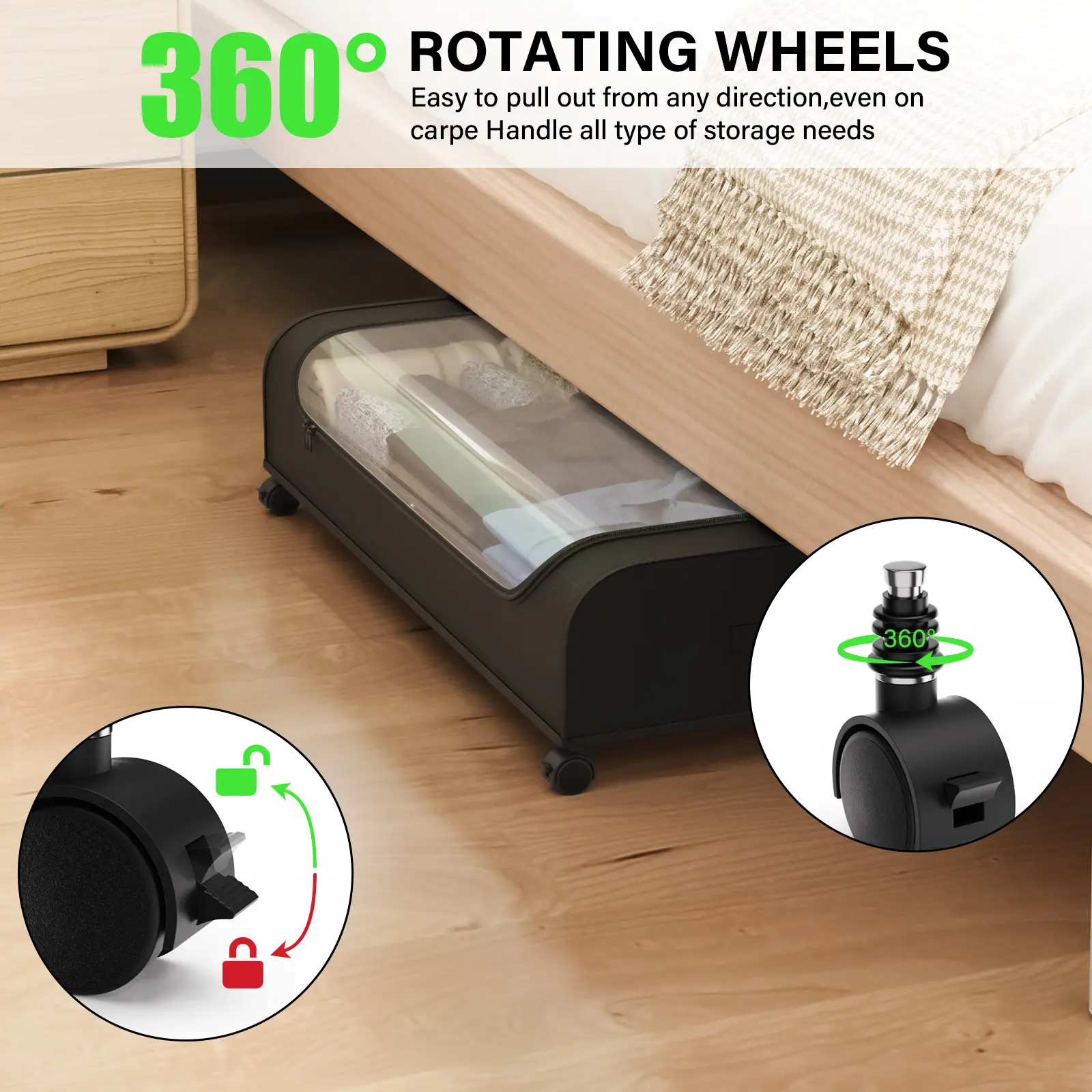 ·360°Rotating Silent Wheels: Say goodbye to constantly carrying heavy storage boxes around your house.This under bed rolling storage comes with 4 x 360°rotating wheels,two of which have locking function.When you need it to remain stationary, just press the locking mechanism gently. No matter how full the cart is, adults and children can easily slide on the floor and carpet