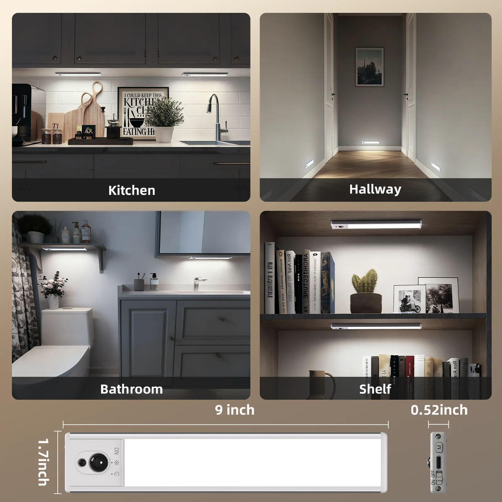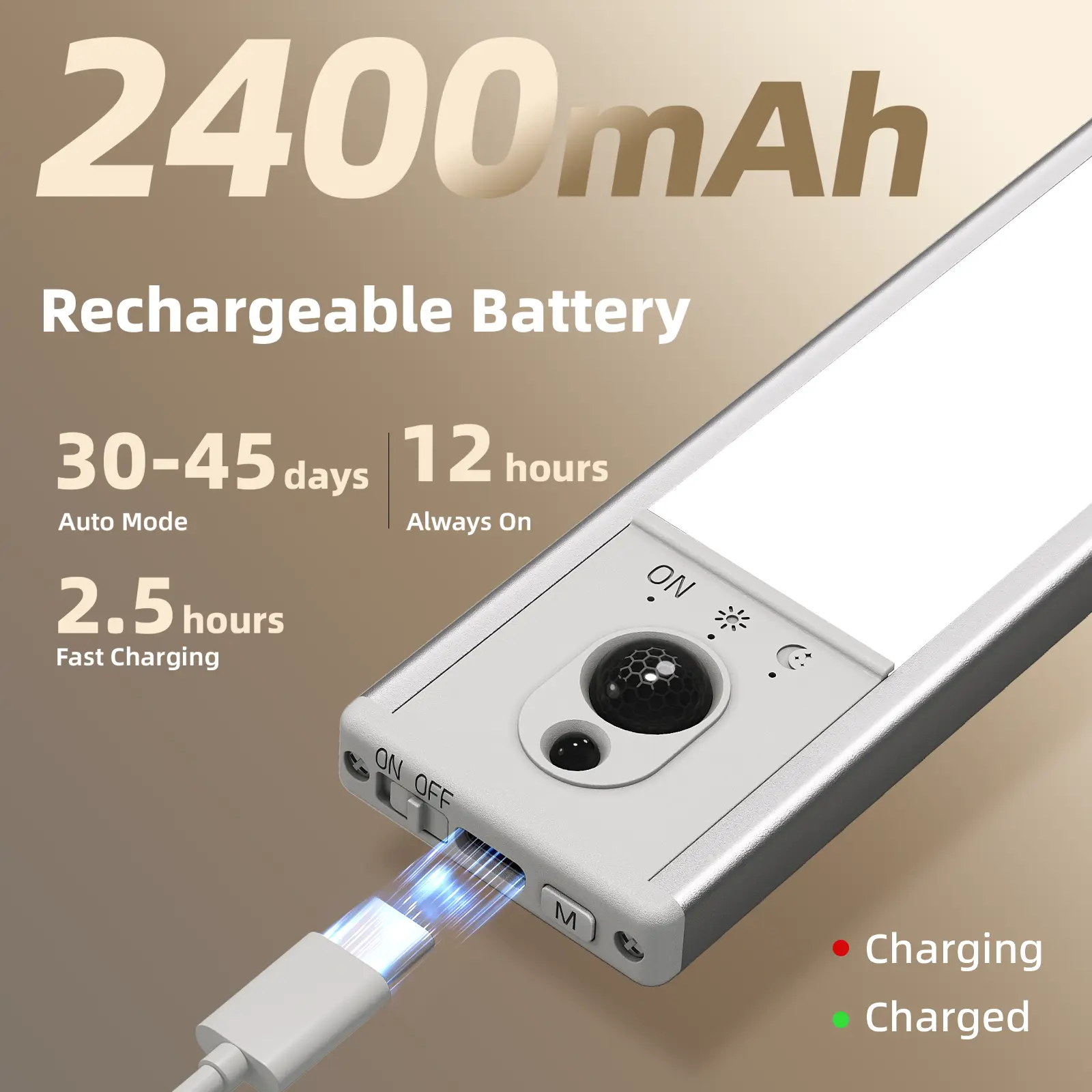 With a 2400mAh rechargeable battery, the motion sensor light indoor offers enhanced versatility. In Always-On mode, it can stay illuminated for 12 hours with the maximum brightness. In AUTO mode, it can last for 30-45 days with an illumination frequency of 10-20 times daily for 20s each.The motion sensor light utilize Grade A+ Lithium-Polymer batteries with high energy density and long cycle life. ( Charging: Red Light, Charged:Green Light )(Please charge before first use)
