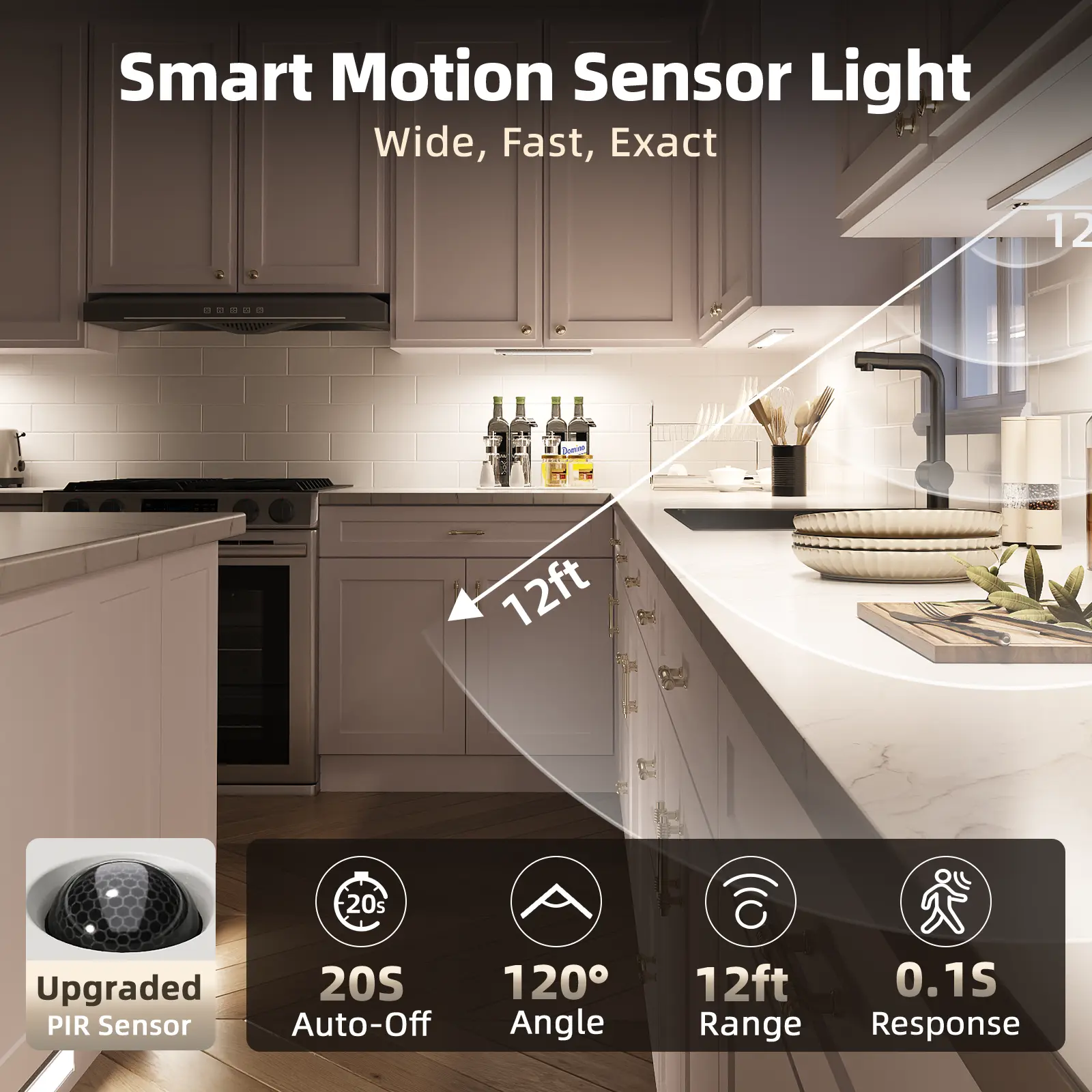 In [Day Mode], the motion sensor lights turn on with motion day or night, but [Night Mode] is activated only in dark environments when movement is detected within a 10ft / 120° range and shuts off automatically after 20 seconds of no movement. To conserve energy, it won't turn on in sufficient daylight.The lights are ideal as closet lights, under cabinet lights wireless, wine cabinets lights, and display lighting, rechargeable under cabinet lighting.