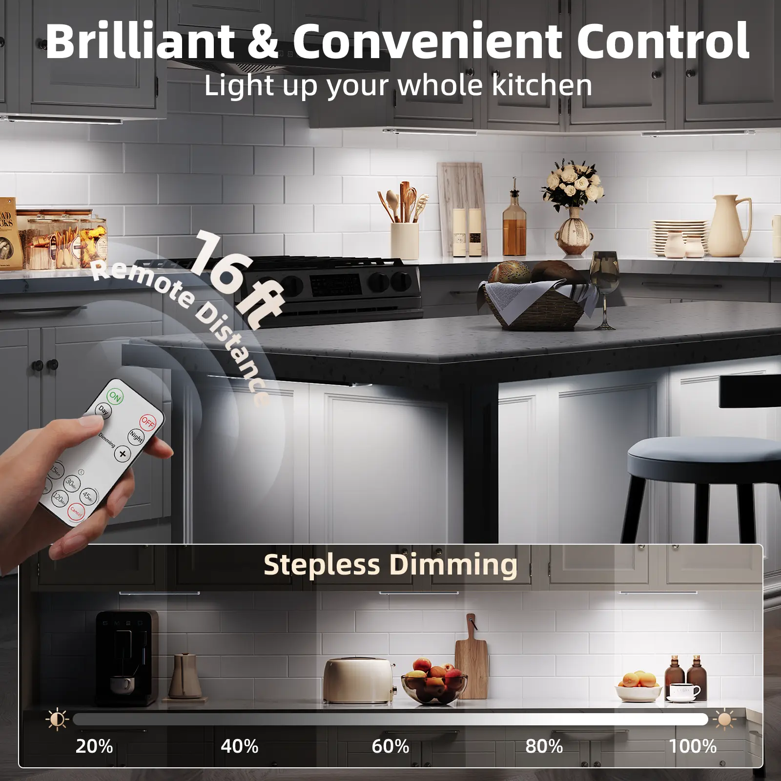 Comes with a remote control, you can choose from ON-AUTO(Day/Night)-OFF modes. [Auto mode] is suitable for general purposes, for general purposes, with timer and dimming settings available on the remote control. Select [Always-On] for specific tasks, and [Always-Off mode] for energy-saving.You can adjust brightness from 0% to 100% by pressing the button of the remote control. You can use it as the under cabinet lighting or place it in higher closets, controlling them remotely.